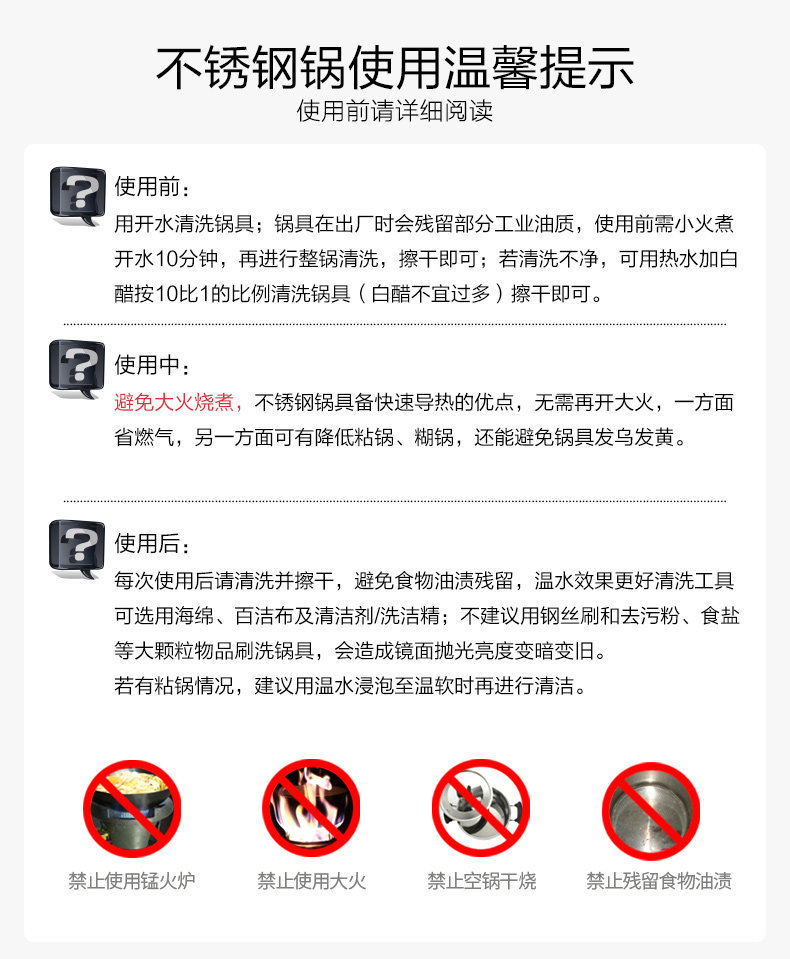 避免大火燒煮:不銹鋼鍋具具備快速導熱的優點,無需再開大火,一方面節約燃氣,一方面可以降低粘鍋糊鍋,還可能造成鍋具發烏發黃。另外大火會讓水分迅速沸騰,蒸汽無法排出,導致鍋蓋會被頂起來。
