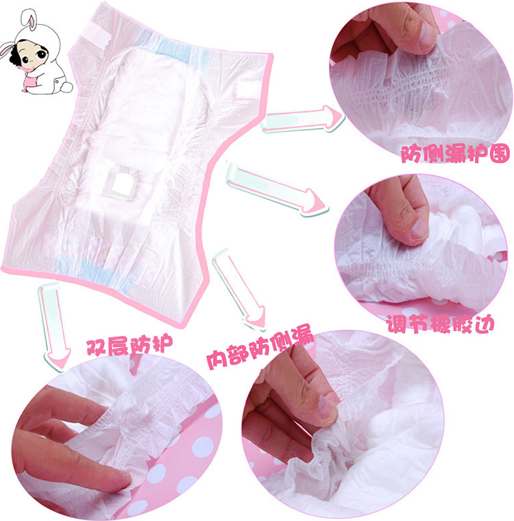 尿褲的搭接采用和寶寶尿褲一樣的不干膠搭接方式,方便調節腰圍,