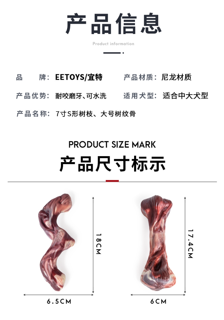 【名稱】:大號樹紋骨 【品牌】:Eetoys/宜特 【規格】:174*60*53mm 【重量】:0.183kg(帶包裝重量) 【材質】:RUBBER+PA/PA