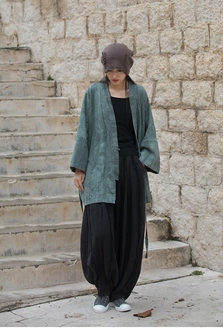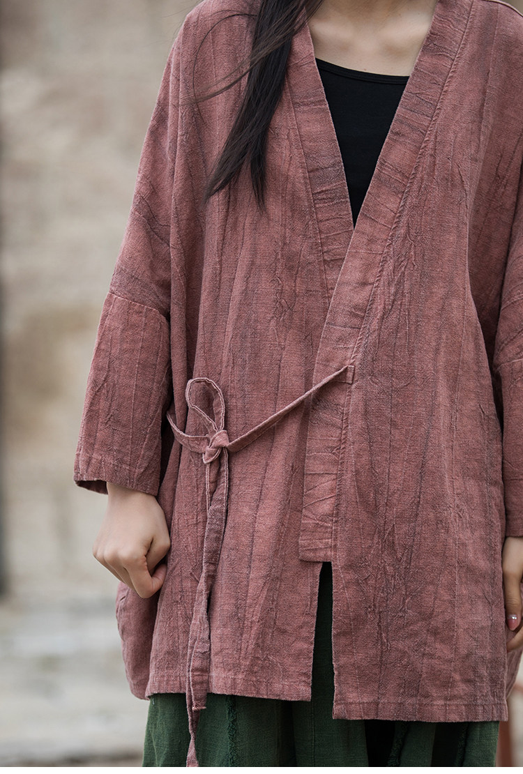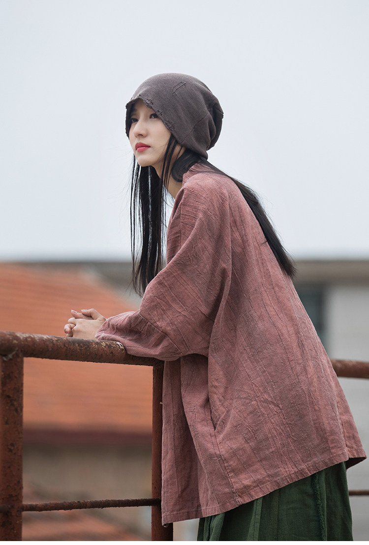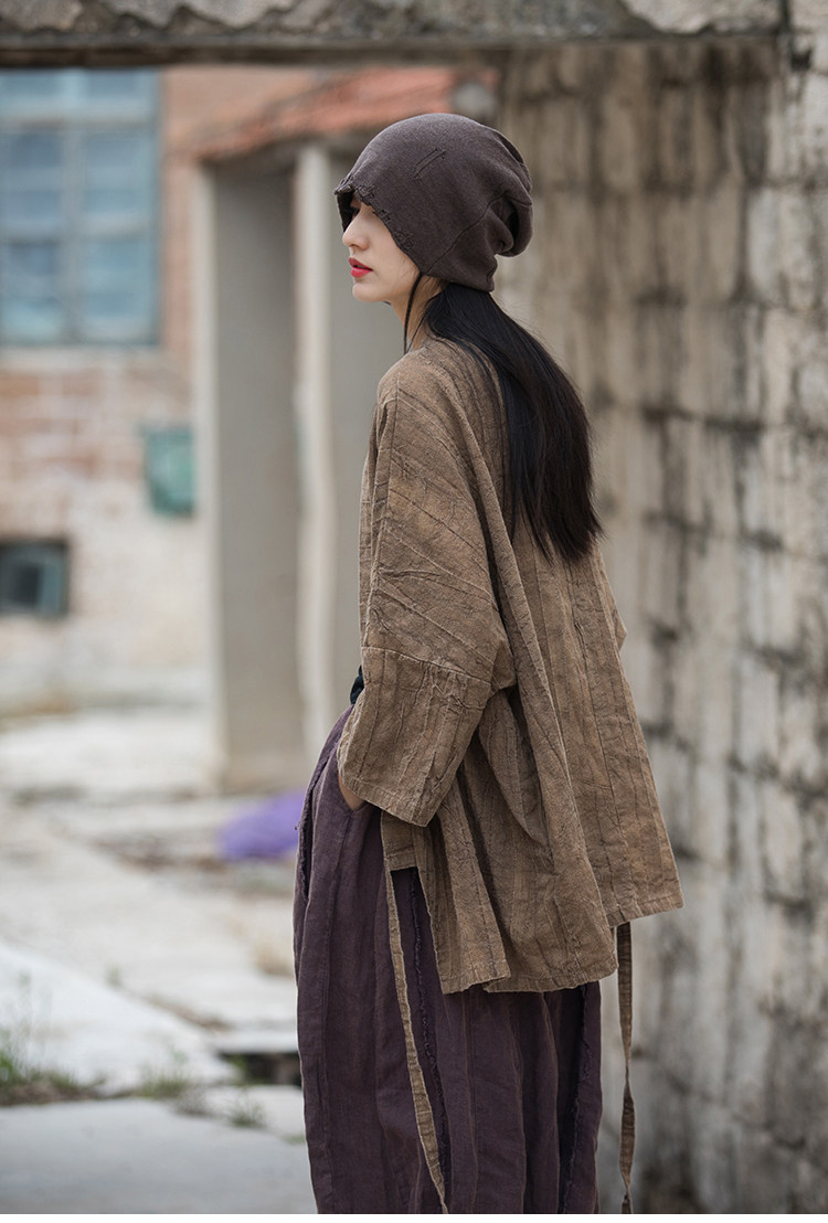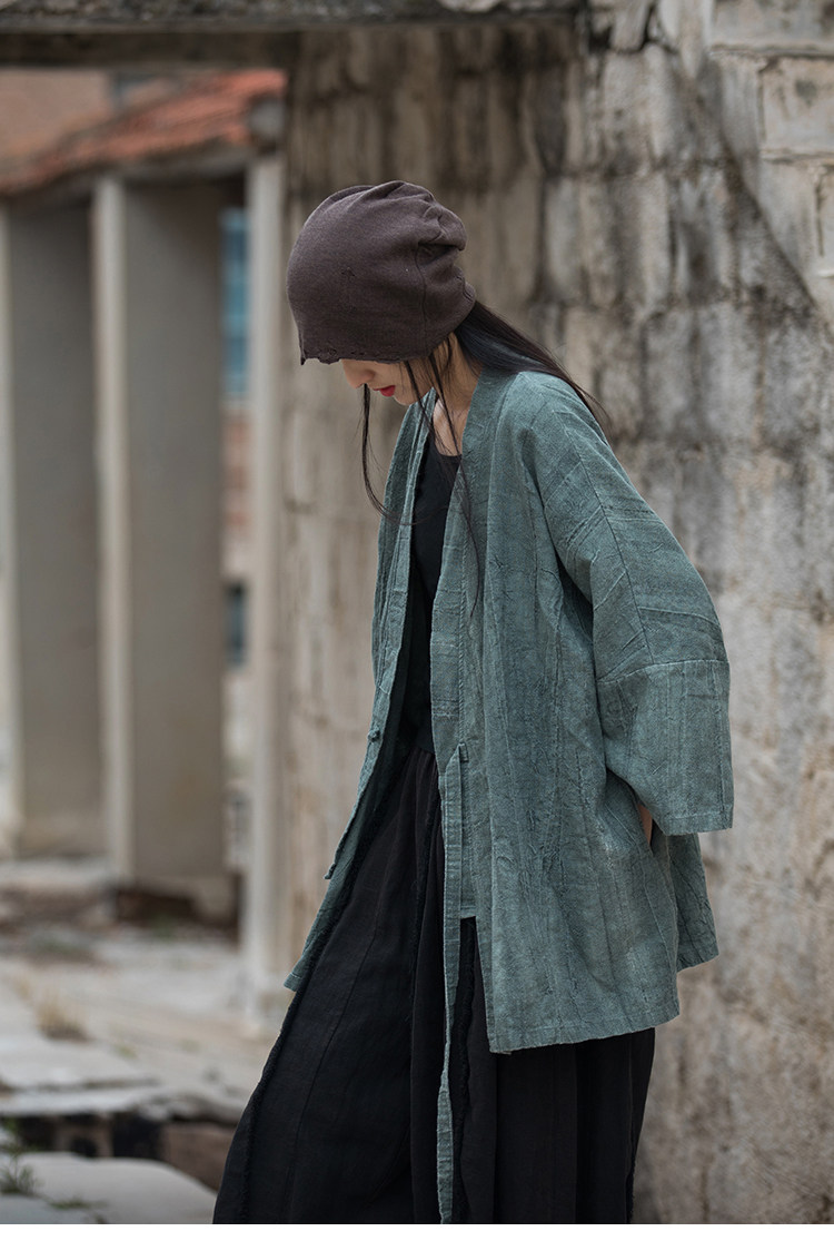 古樸復古做舊開衫有質感的苧麻棉面料經過扎染工藝,表面自帶深淺不一樣的褶皺肌理色彩細膩中暗含時光之感V領對襟中式系帶,內置一粒扣設計,豐富了層次感寬松廓形,遮肉又顯瘦~苧麻棉(苧麻70.8%,棉29.2%)領中到袖口67cm,胸圍152cm,底邊142cm,衣長75cm,袖口36cm模特高168cm,體重49kg