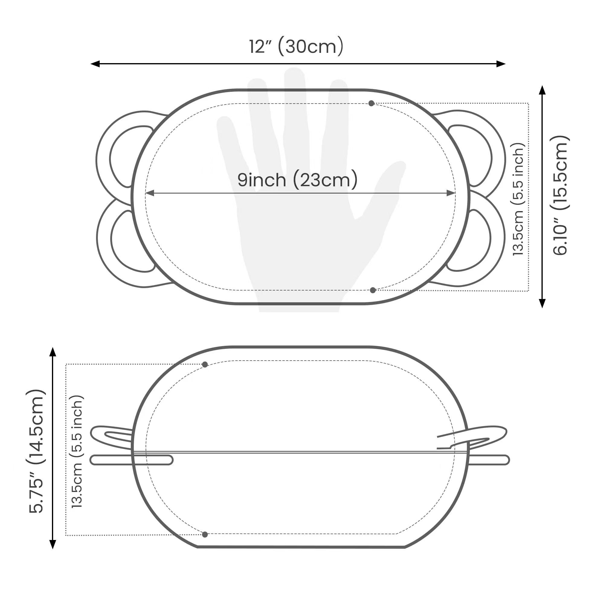 橢圓膠囊雙用鍋 長度24.5cm 帶把手總長度30.5cm 寬度15.5cm 單鍋高度8cm