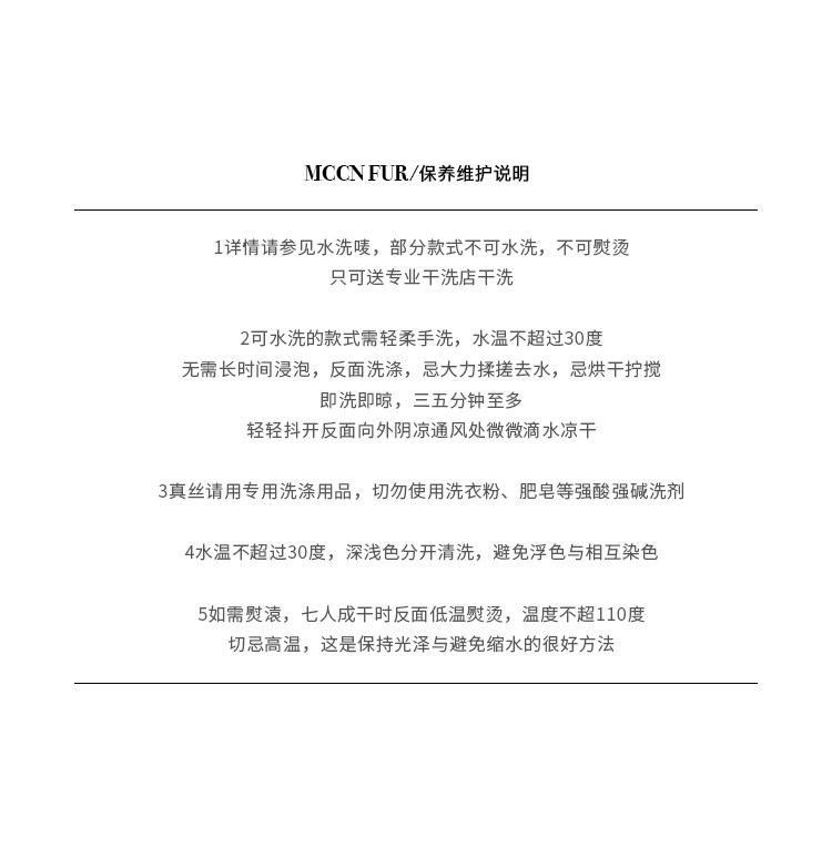 | 保養維護: 水洗的款式需參見水洗嘜 部分款式不可水洗 不可熨燙 只可送專業干洗店干洗 |
