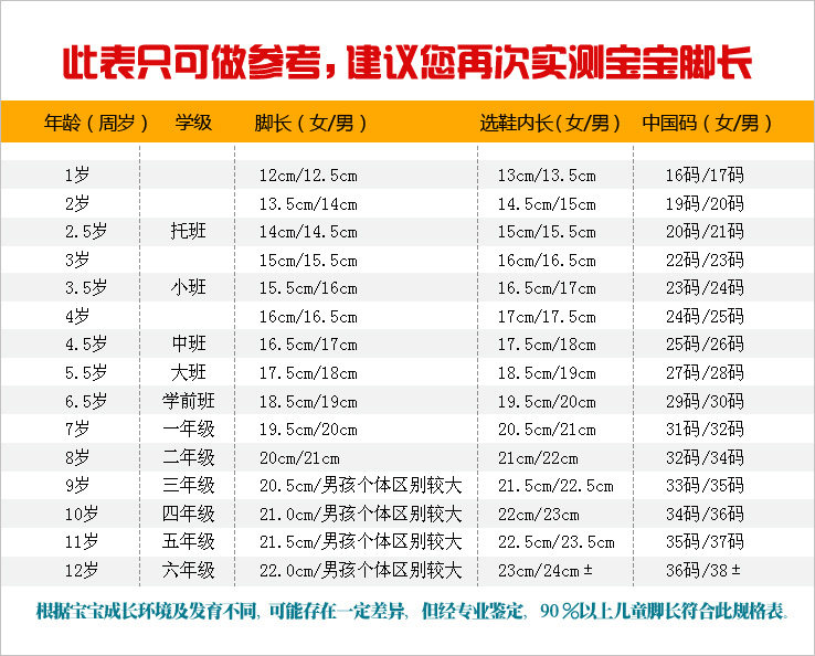 腳長的正確測量方法:讓寶寶踩在一個鞋盒內,腳跟頂到盒子的邊,在腳趾處劃一條線,再量鞋盒邊到線的距離。(不要人為增加,比如量出15.3cm,就不要說是16cm的,不然穿起來會松松垮垮的。)