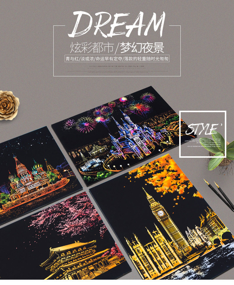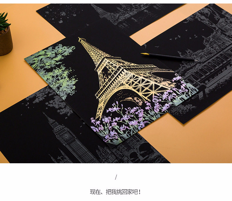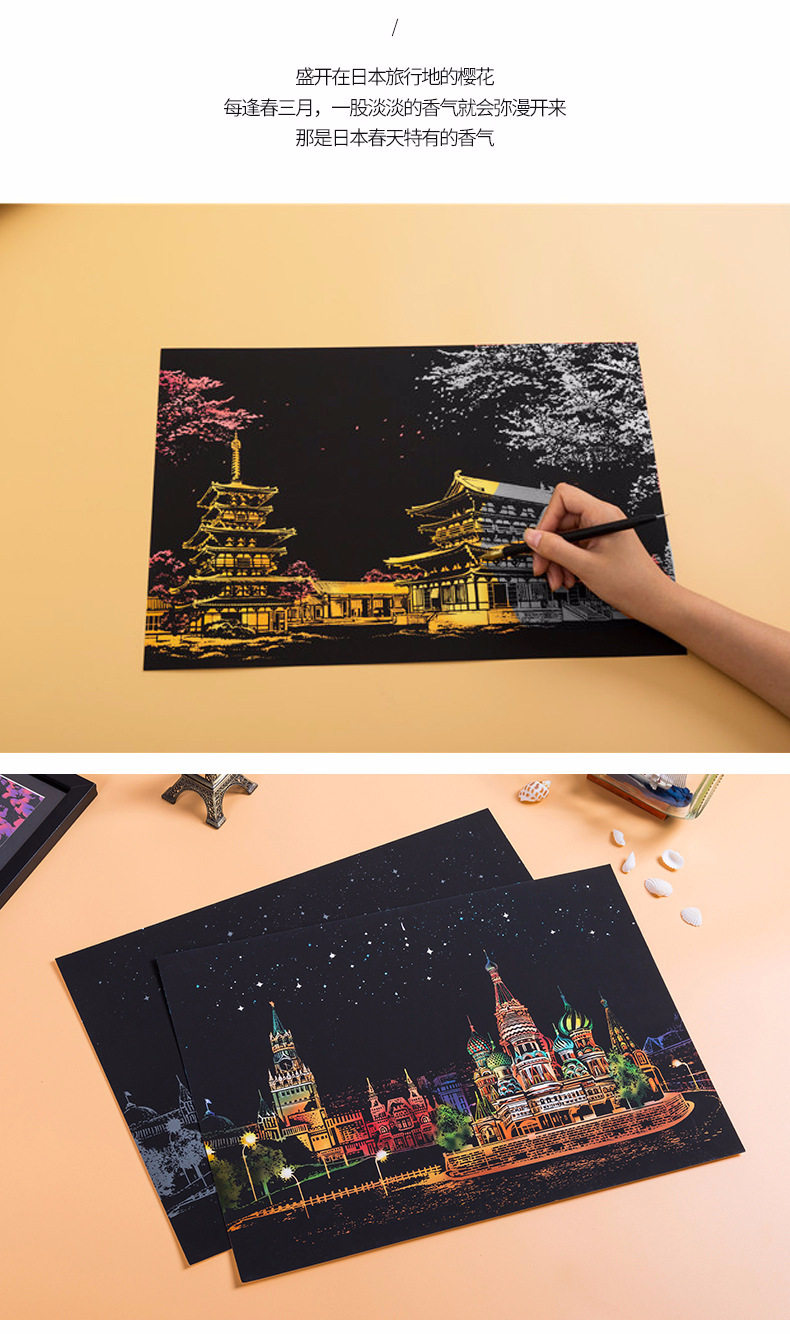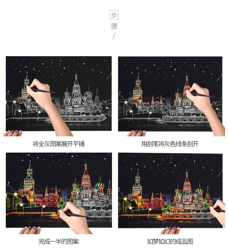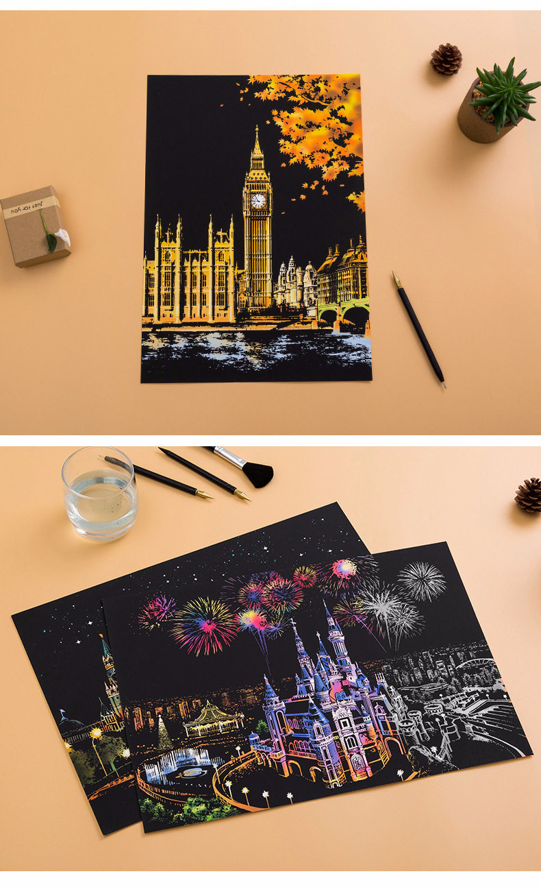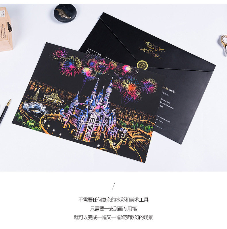 內物包括:夜景刮畫一張,自由diy刮畫一張(無圖案),五件刮畫工具