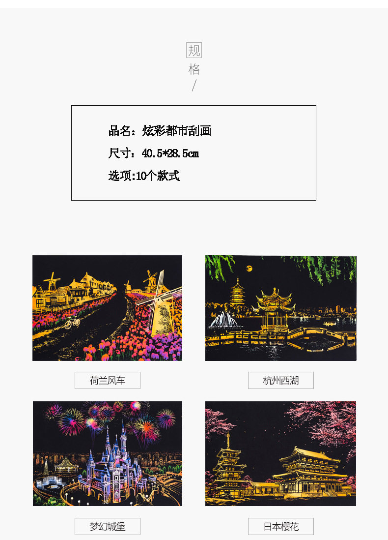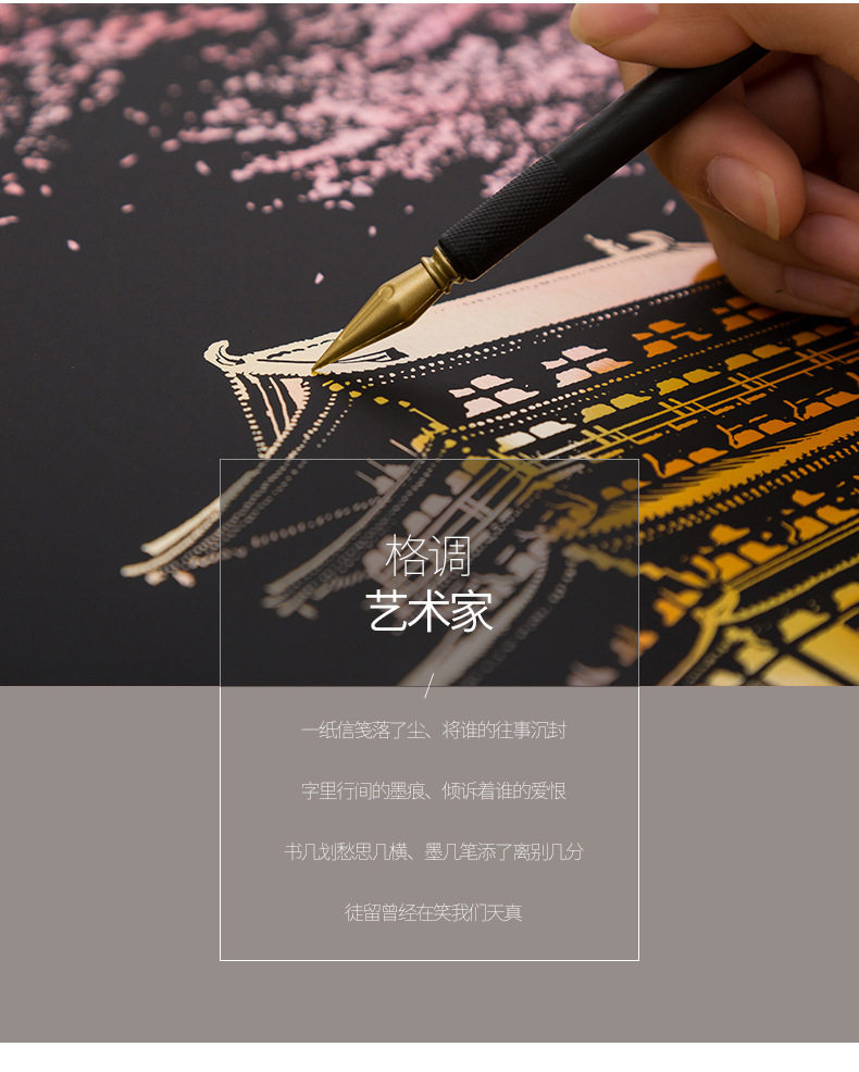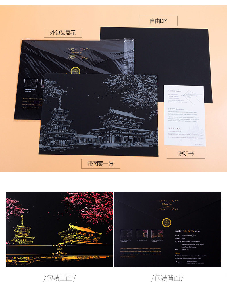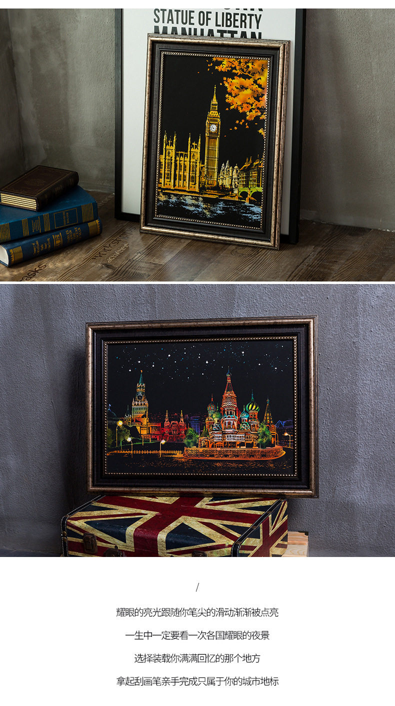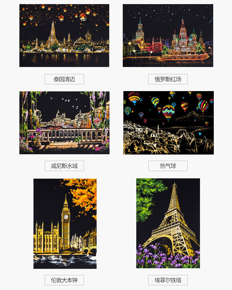 內物包括:夜景刮畫一張,自由diy刮畫一張(無圖案),五件刮畫工具