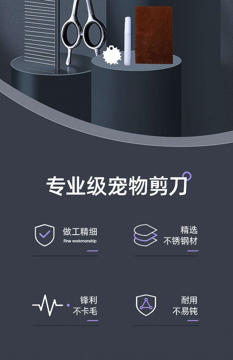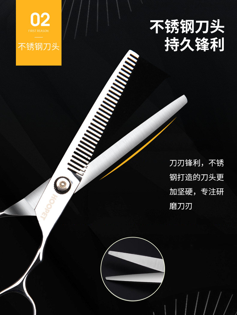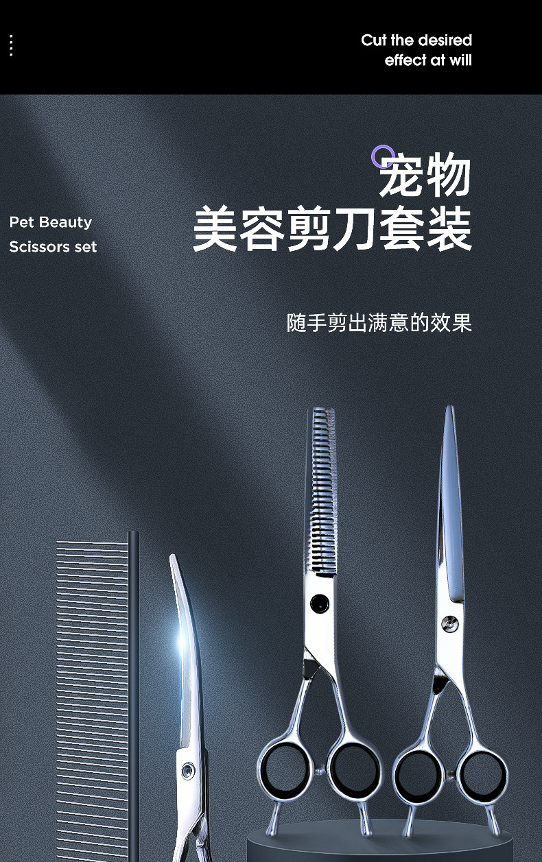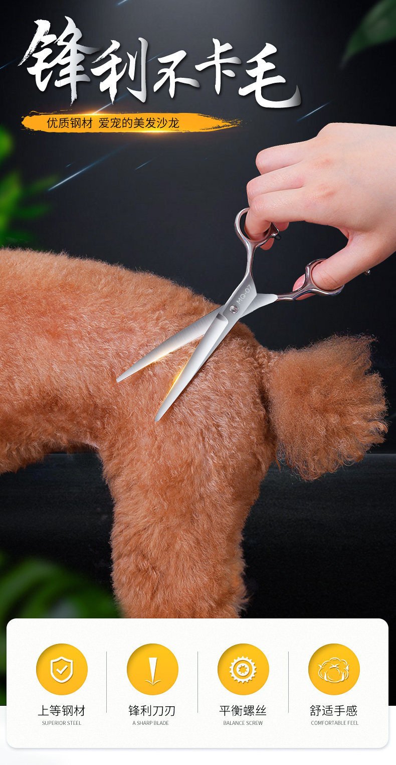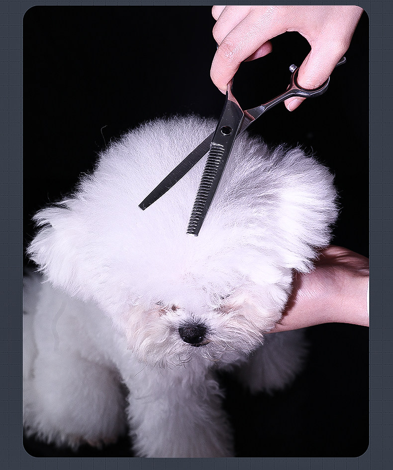 7寸直剪|適合打薄毛發,是寵物日常美容常備的工具。其長度適中,方便整體和局部造型修剪,一般配合牙剪使用更能修剪出理想的造型。也可作為電推剪修剪之前的長毛輔助剪短。