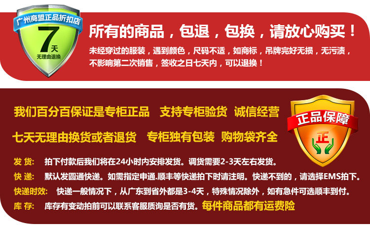 1、所有品牌百分百正品,價格實惠。 2、團購于專柜正品,支持驗貨,誠信經營。 3、加入消保運費險十五天無條件退換貨,購物無憂。 4、吊牌紙袋三標齊全,親們放心選購。