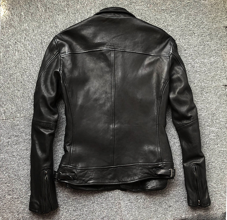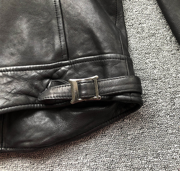 皮料:無涂水染頭層綿羊皮 植鞣全粒面 經過成衣重水洗做舊工藝 有縮水做皺效果 有彈力