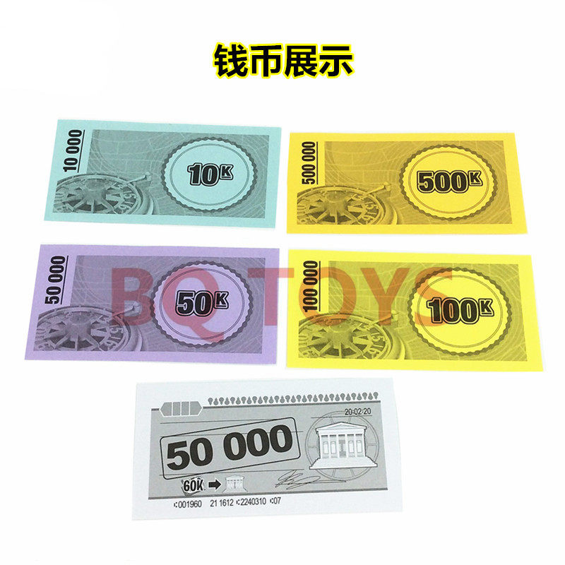 可折疊游戲棋盤1個,汽車4只,膠釘多粒(代表人物,有2色),卡牌一副(5種游戲卡),游戲錢幣(5種幣值),游戲轉盤,