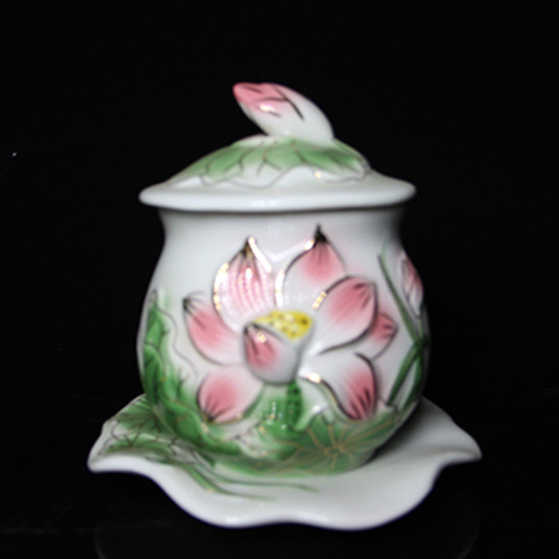 【品名】:浮雕彩釉蓮花圣水杯【尺寸】:小號總高10cm底盤直徑10cm 杯口直徑5.6cm【尺寸】:大號總高12cm底盤直徑11cm 杯口直徑6.6cm【材料】:白玉瓷【類別】:圣水杯