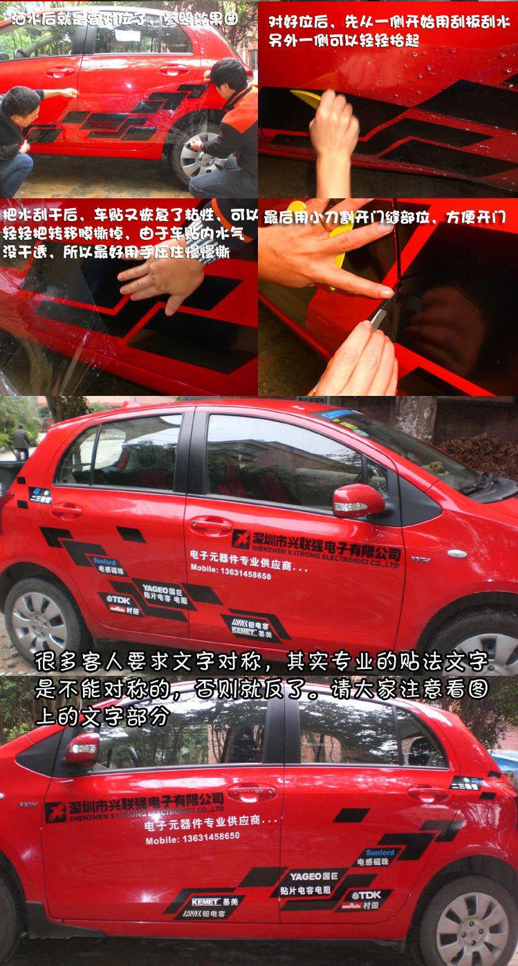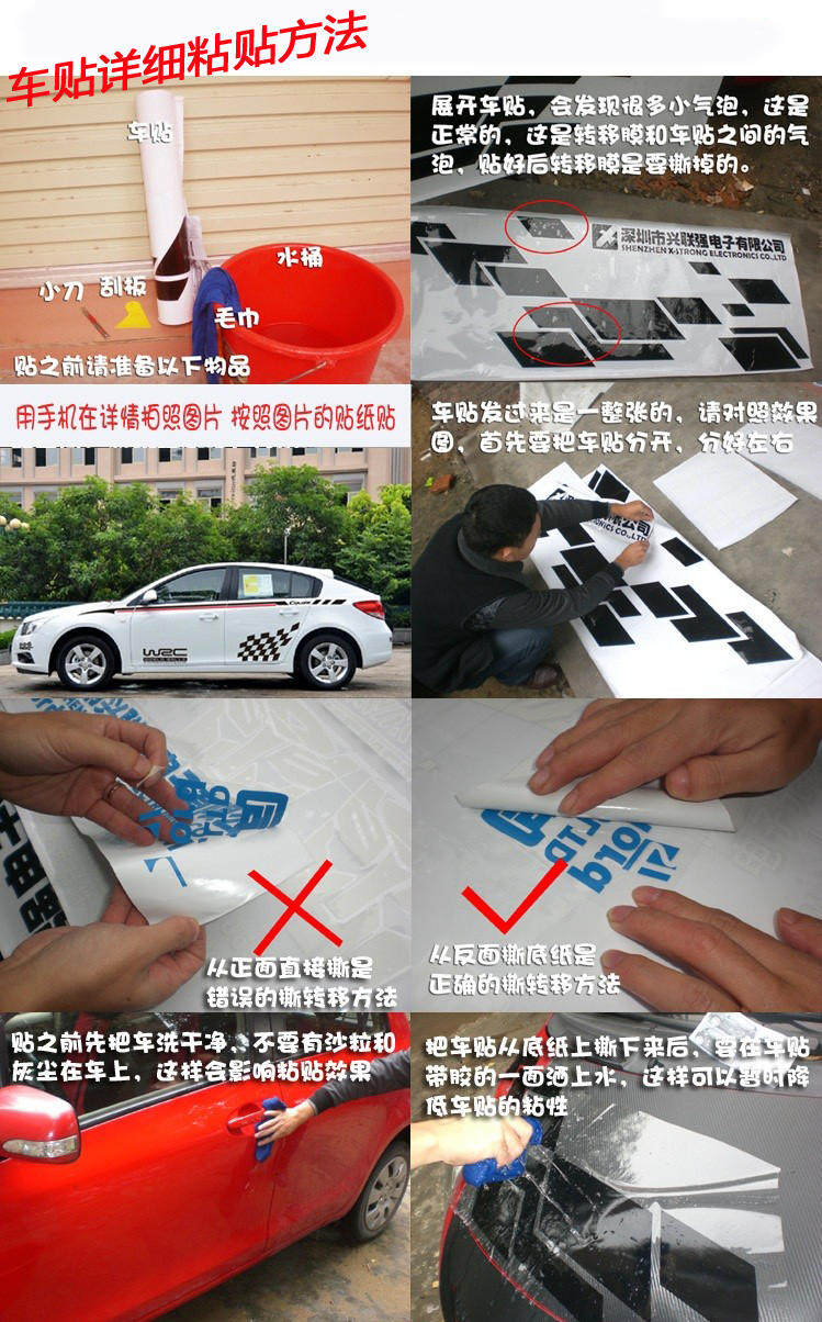 3.采用貼汽車太陽膜的方法,用專用的噴水壺,加入干凈的清水,加以適量的洗潔劑或者是貼膜液起到適當的潤滑作用,方便貼紙在車身上的挪動;