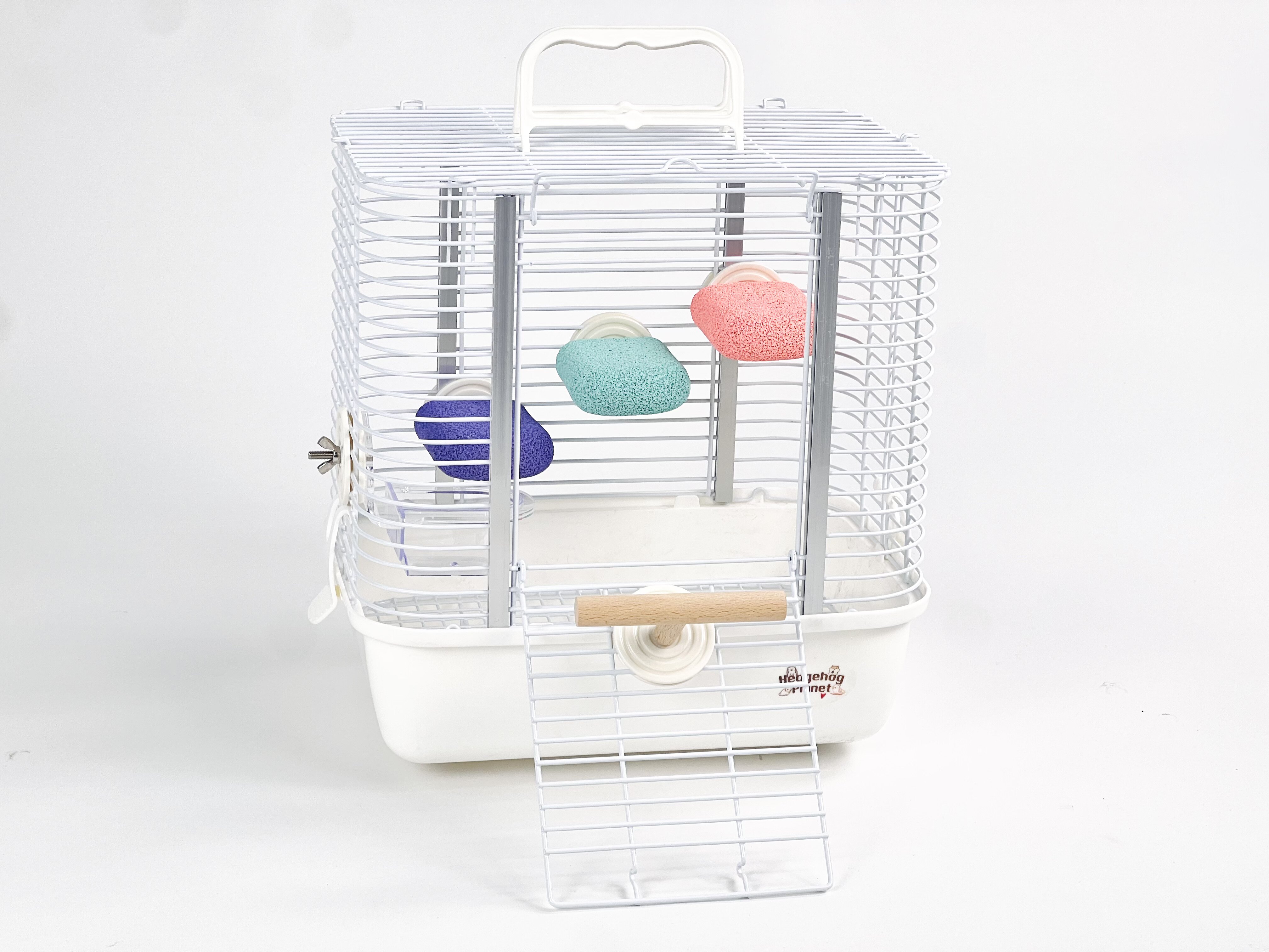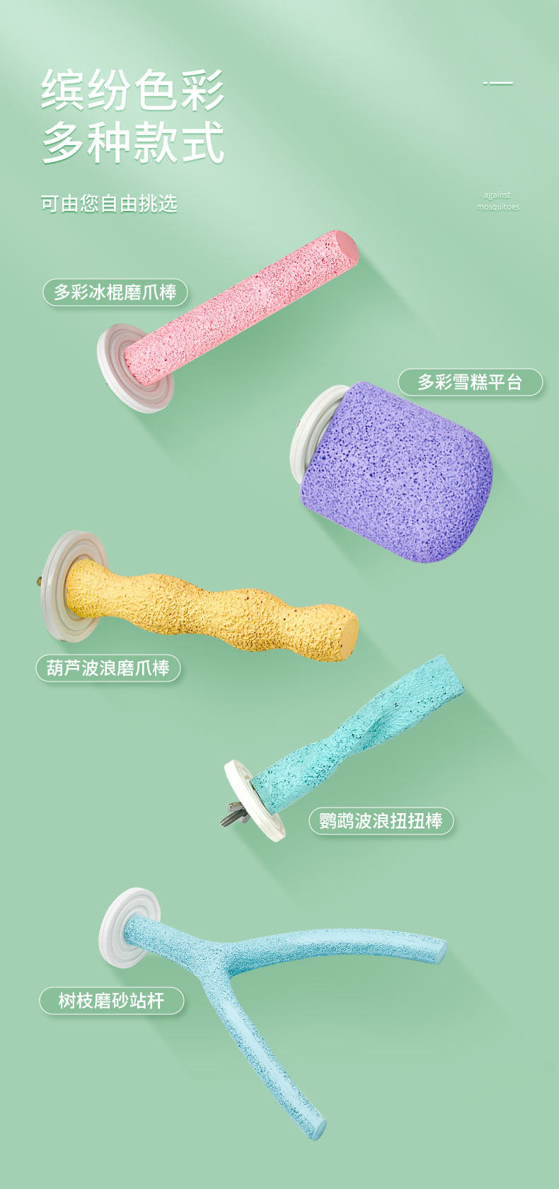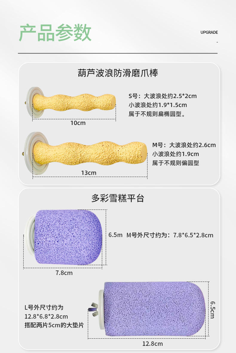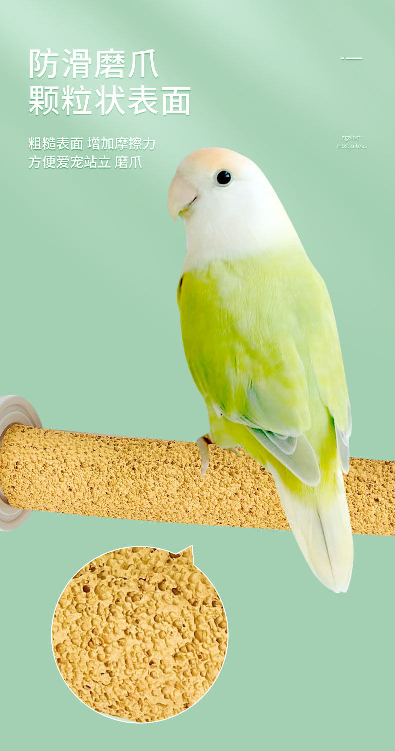表面為凹孔細密的磨爪表面,橫向為小型磨爪平臺,豎向也可以作為小型鸚鵡的窄面站桿使用。