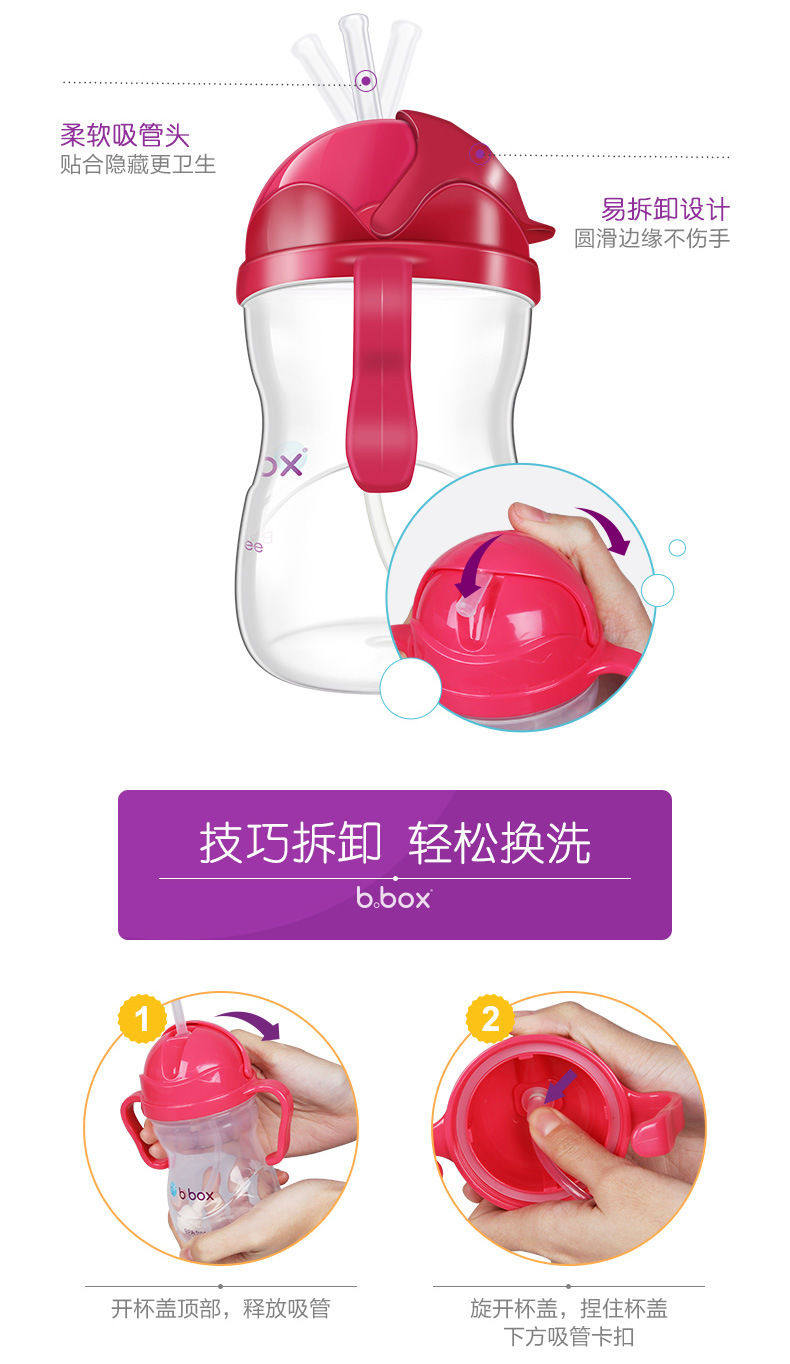 B.BOX吸管杯為重力球設計,360度無死角飲水,能喝的更干凈,寶寶無論躺著坐著,或者將杯子豎起,都可以喝到水,不用擔心因為吸水孔未觸及到水而吸進空氣, 密封性好也不怕寶寶摔倒杯子的。提醒:杯子的消毒方式建議是溫水清洗即可!