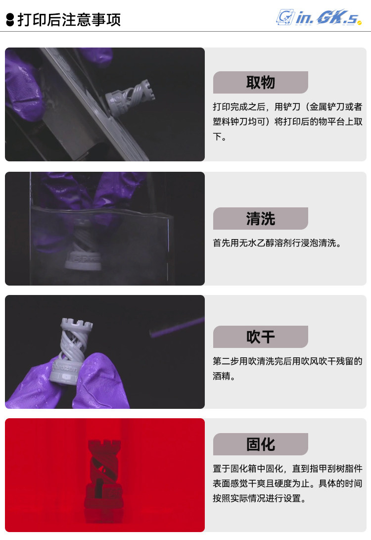 1.打印完成的樹脂件表面殘留液可用95%濃度以上的酒精洗凈,且 清洗過程建議不要超過1分鐘,