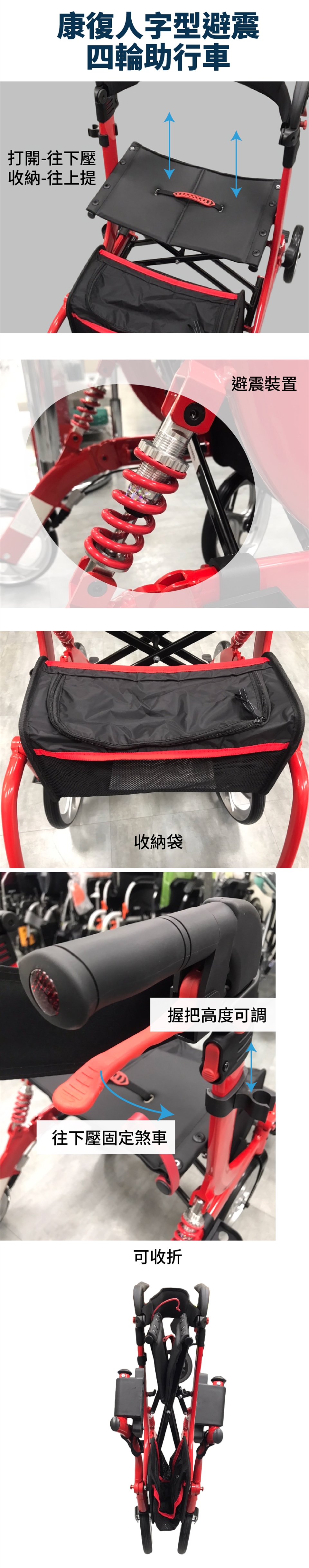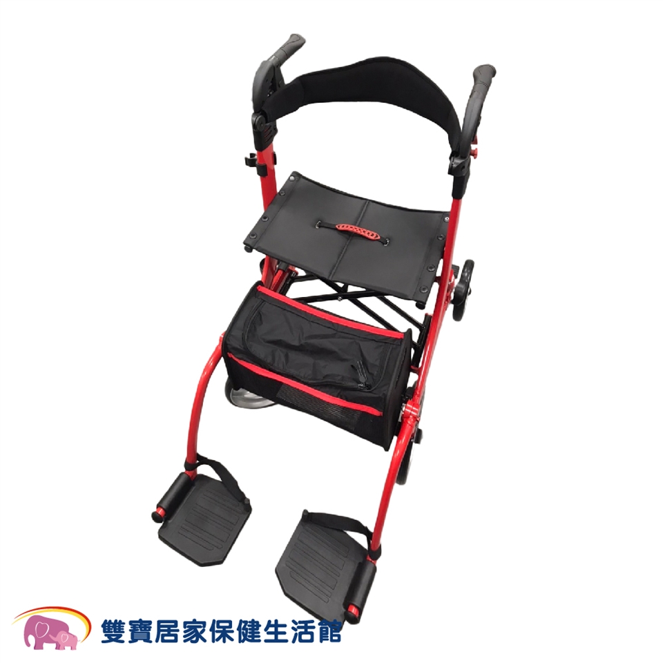 材質:主體-鋁、握把-TPE、座墊-PU防水布、泡棉、物品袋-尼龍、前叉-鐵、拐杖盒-PA、輪胎-PP+TPR