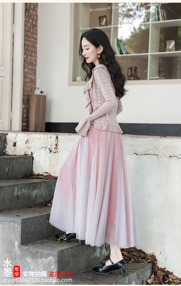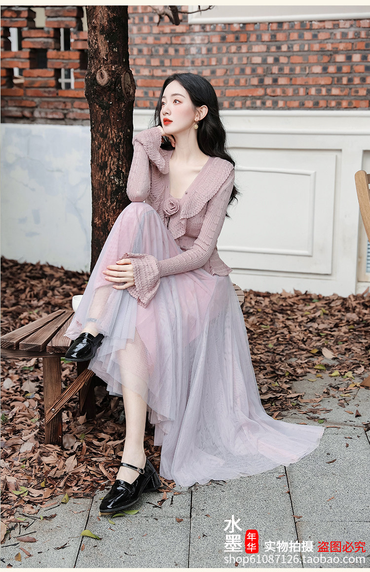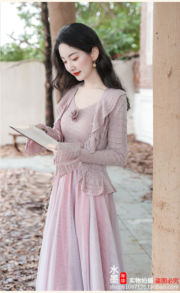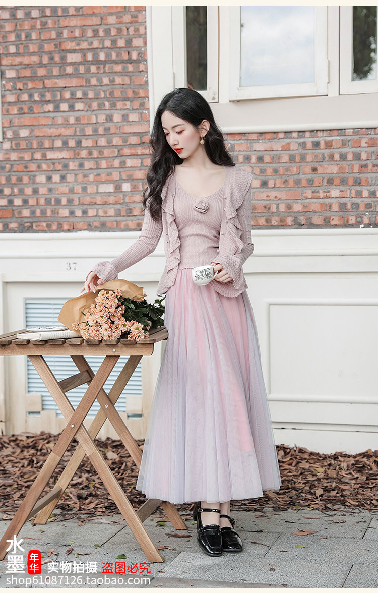 秋季三件套女裝甜美文藝森系穿搭套裝重工鉤花毛衣針織開衫外套女