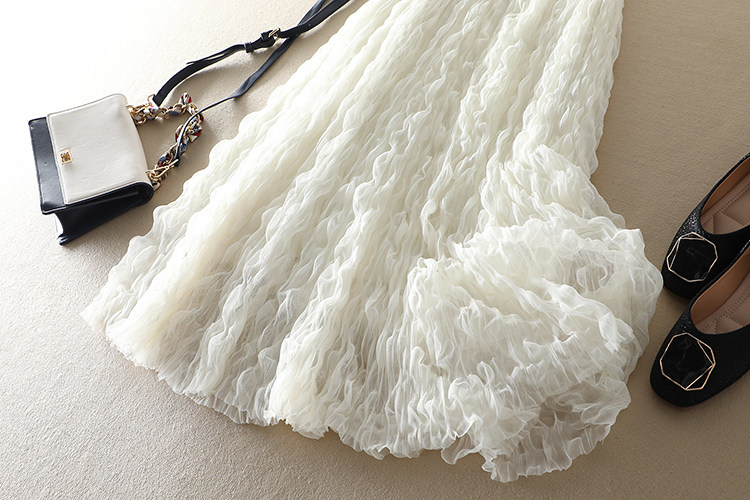 高腰A字大擺長裙版型,整體做有四層設計,外層重工波浪卷毛壓褶,中間兩層平紋網紗,內加一層舒適里襯;淺色著裝也不透。