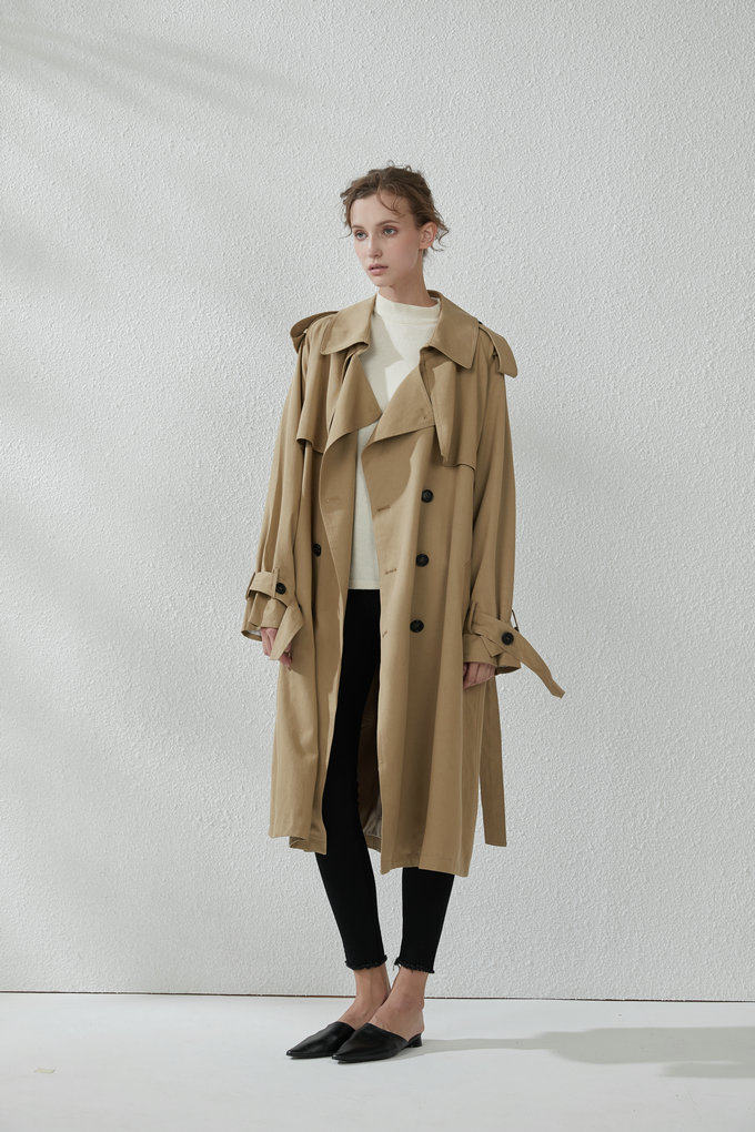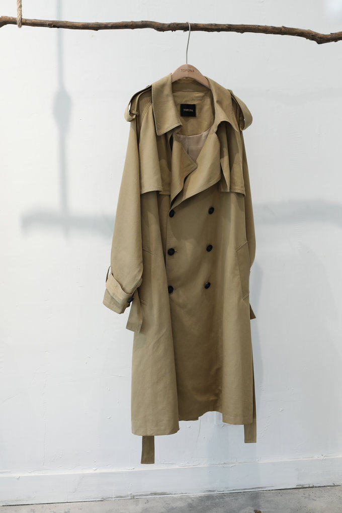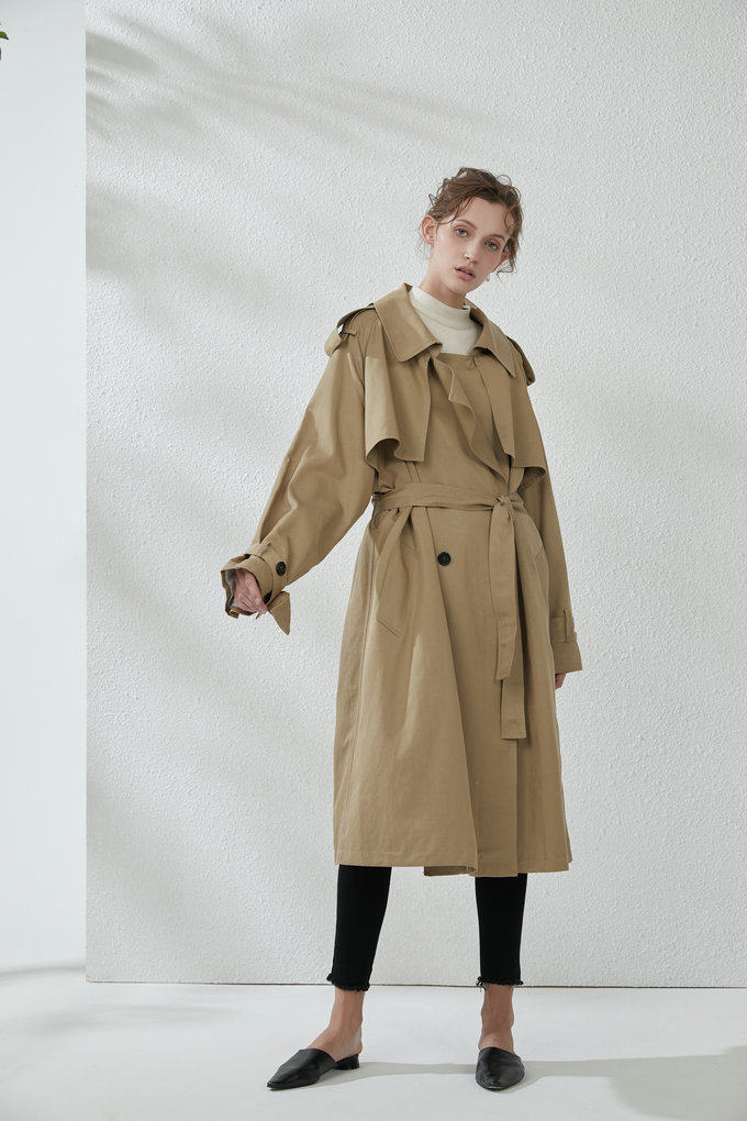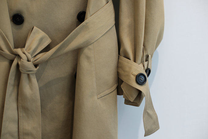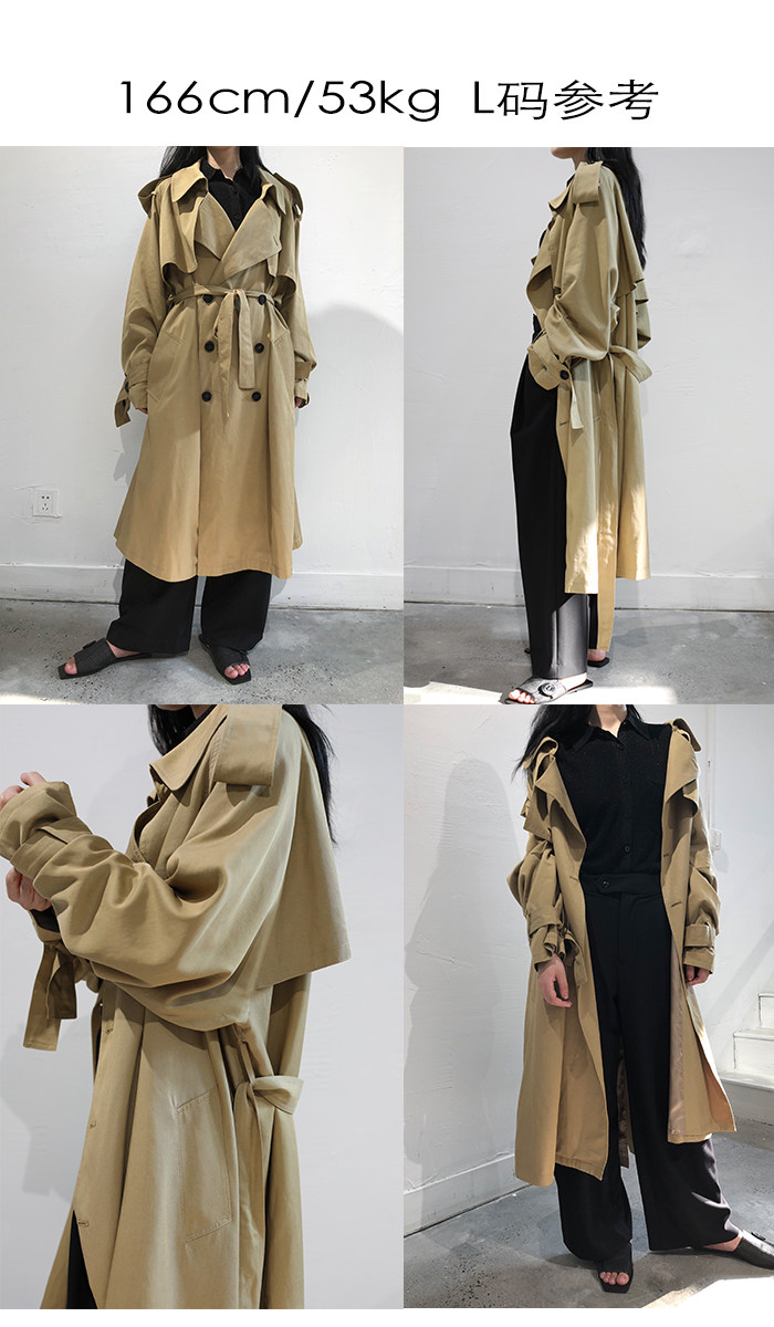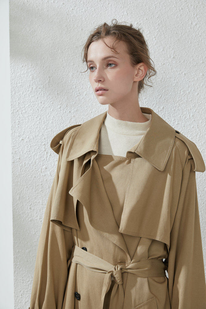 這款風衣的面料非常的柔軟、垂墜、飄逸,不是硬挺的挺闊面料