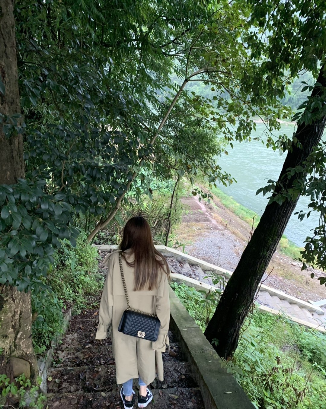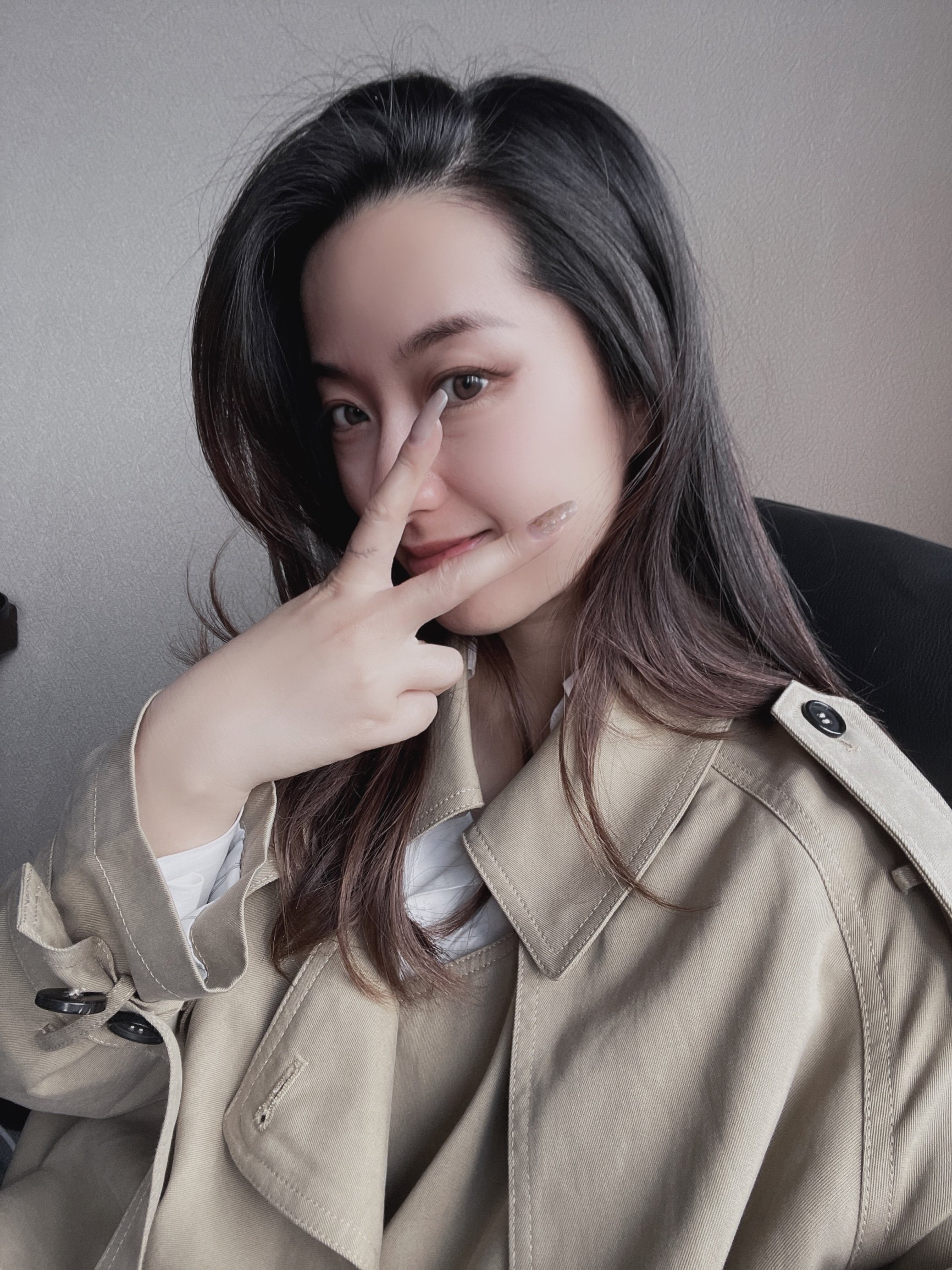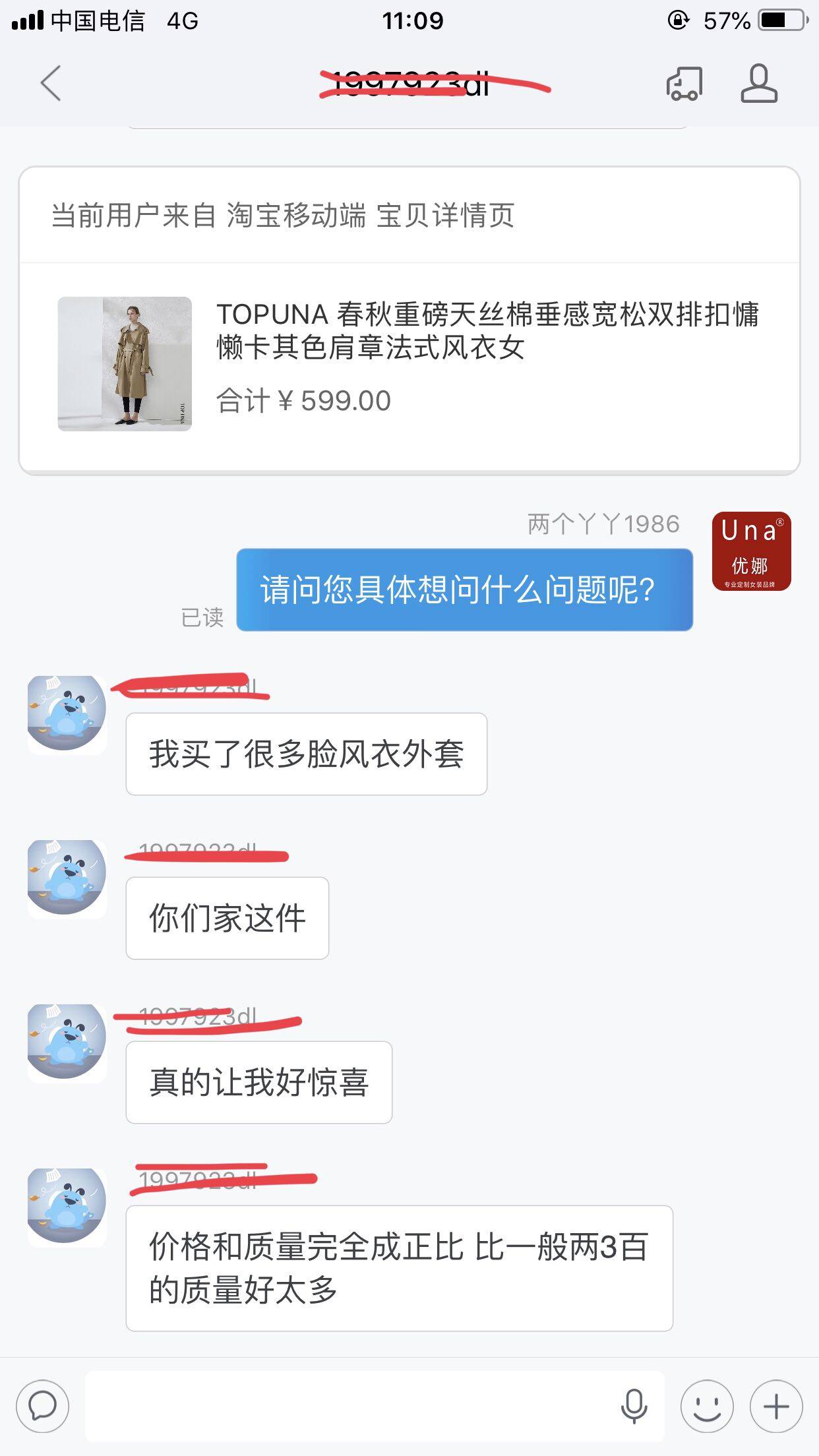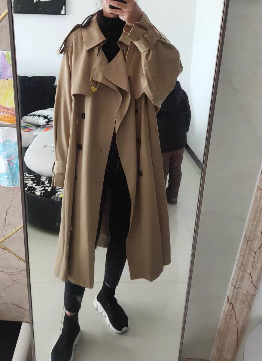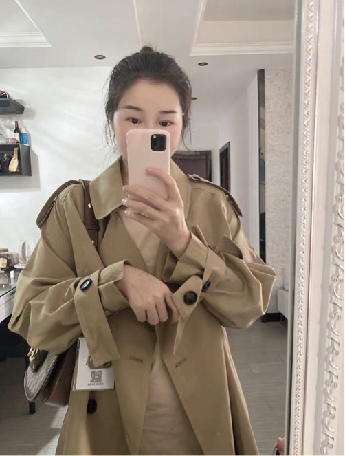 3、、顧客身高158,體重100斤,選S碼數,收到穿著效果很滿意,(小插曲:開始溝通的時候,顧客的體重100斤我們是不建議顧客選S碼數,但是,顧客說風衣不就是應該松松垮垮的穿著撐不起來的效果嗎?,喜歡顧客的風格)