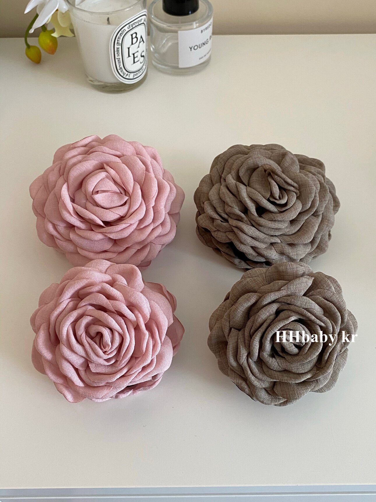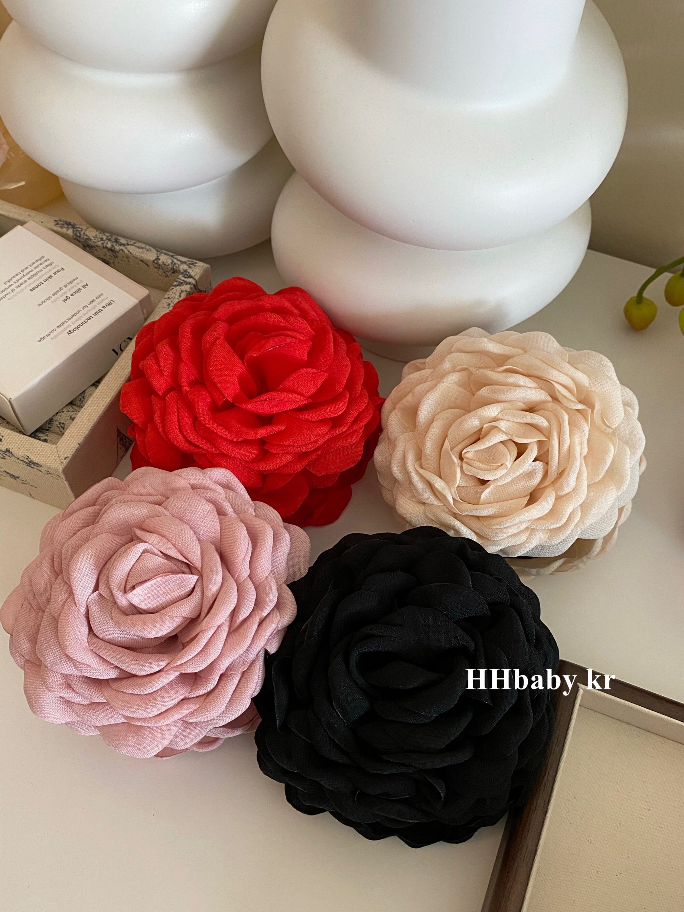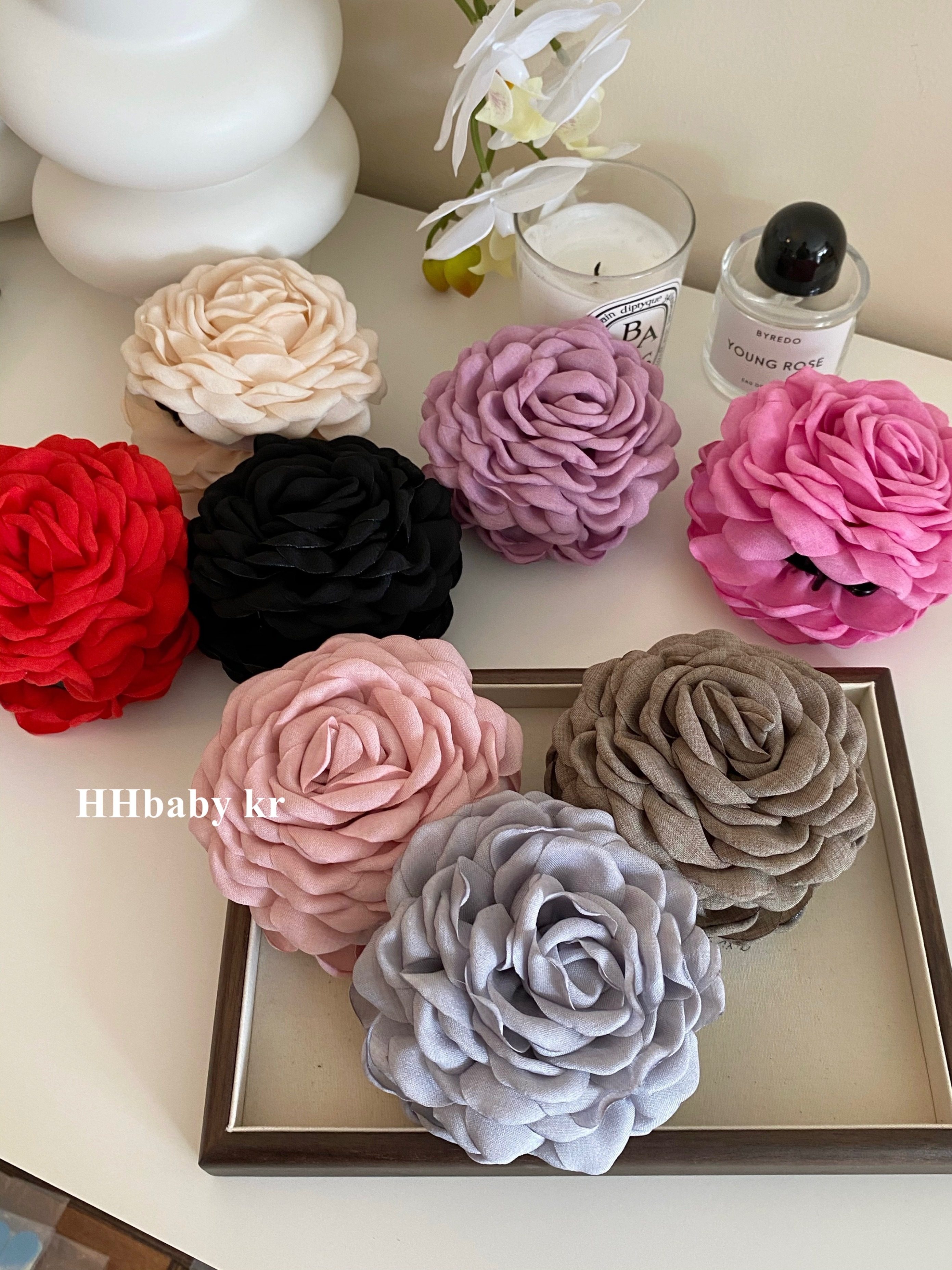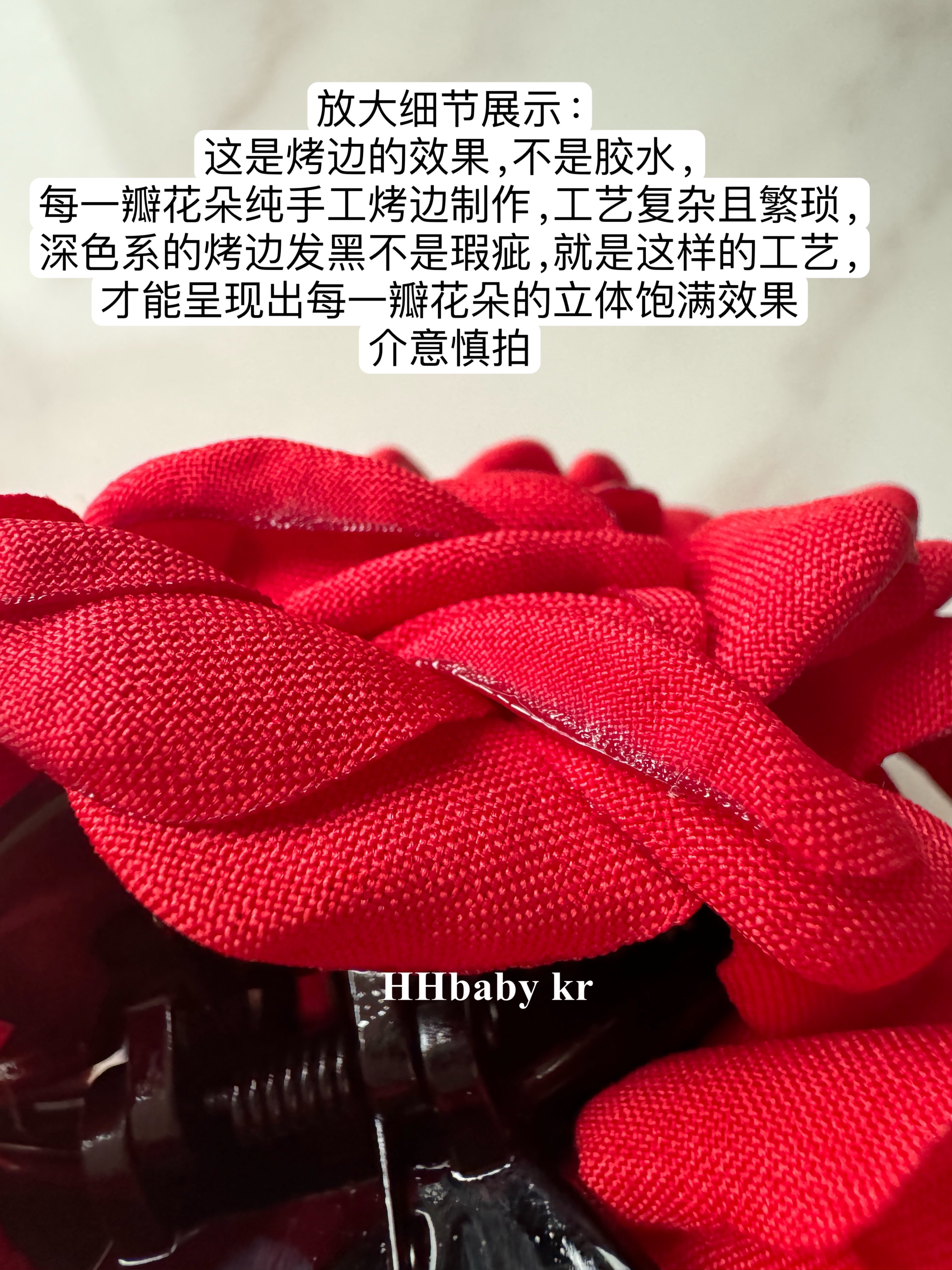 由于花瓣是布藝材質,要用烤邊工藝才能作出卷曲花瓣形狀,布藝顏色深,烤邊顏色就深,工藝需要,不是瑕疵。