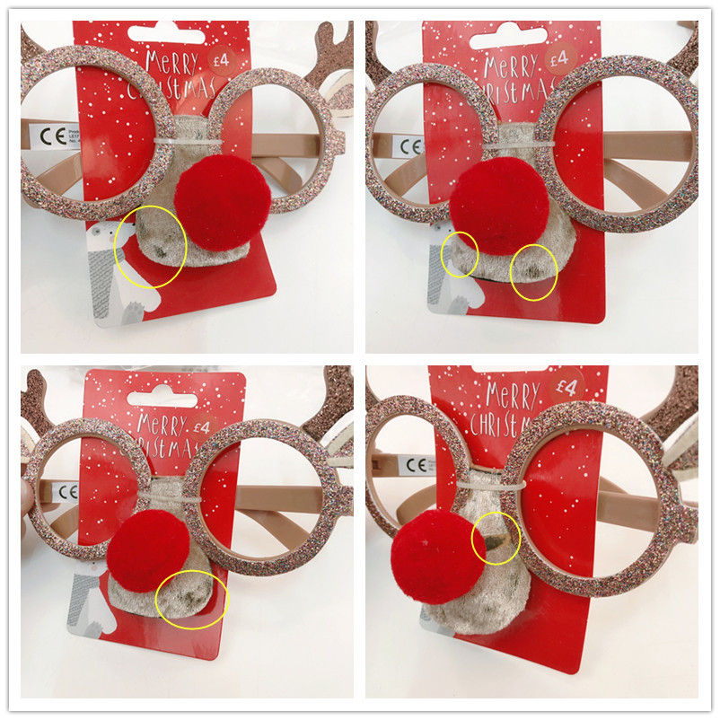 PS:不同批次卡紙顏色和款式有點不同。紅鼻子款有的批次鼻頭紅色部分故意有點歪斜自帶喜感,這些都是純手工粘貼,存在膠水痕跡/輕微開裂/小染色串色/顆粒/輕微毛刺/異色等不影響使佩戴的小瑕疵均屬正常,介意慎拍。出口對膠水的要求嚴格,不能用那種有味道的強力黏膠水,襯布是環保織布跟ABS鏡框的粘合度一般,收到如果有點開裂的麻煩自行粘一下~紅鼻子款有的鼻子部分會有毛絨厚薄不均(見詳情頁圖片),介意的親不要選擇這款!