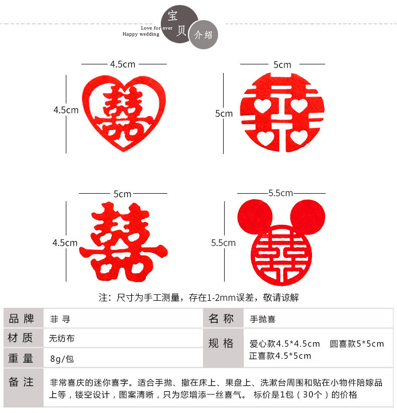 菲尋 婚禮婚房布置裝飾用品 創意手拋喜手拋花婚慶用品喜字彩條手拋小喜字,無紡布材質,一包的價格,一包里面三十個小喜字的哦.用于擺盤,擺床。撒花都是不錯的選擇.三個款式隨個人喜歡挑選的哦。