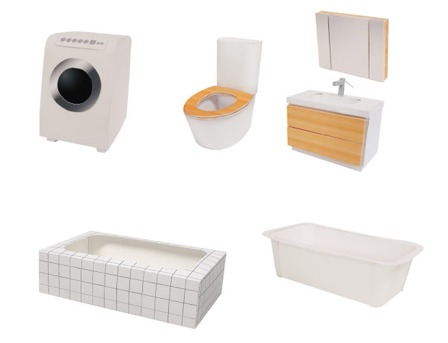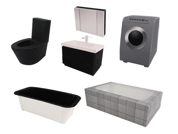 家具尺寸: 馬桶7*5*6cm,洗漱臺上(7*6)下(9*4*6)cm,洗衣機6*5*7cm,內浴缸6*12*4cm,浴外池13*4*8cm