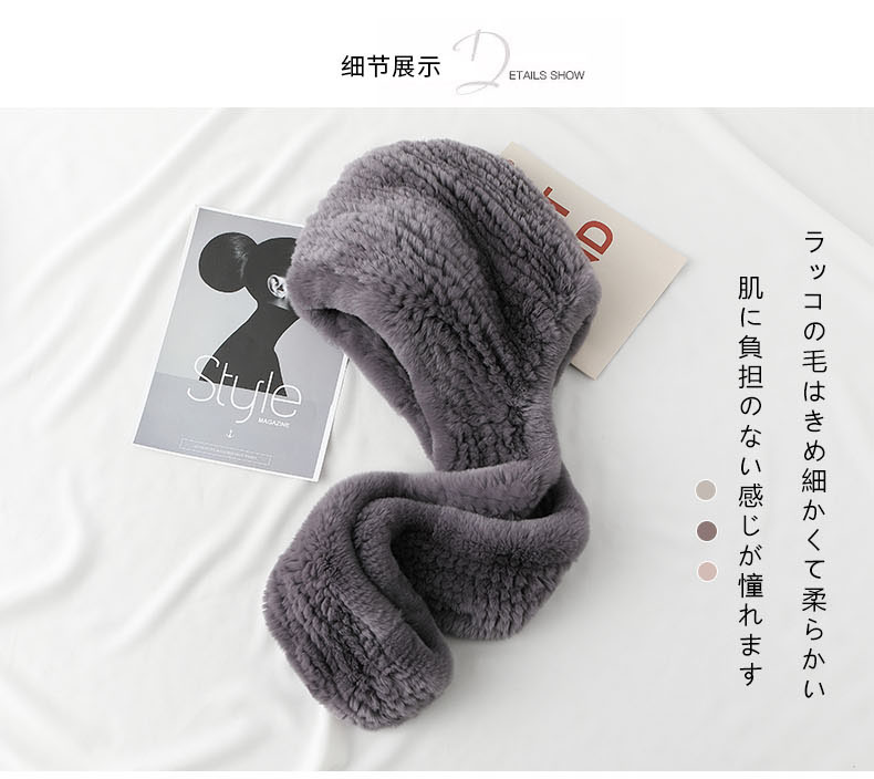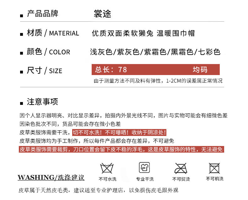 在精細程度上和品質上皆屬于GAO階段位,獺兔毛經過至少幾道工序:洗滌,沖洗,精梳及染色,在品質的嚴格把控及做工細膩,品質感FEI常好,高JI的純色和混色效果讓圍巾的顏色更打動人,溫暖身體和心靈,柔軟光滑,手感細膩,穿著很舒適自在! |