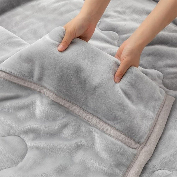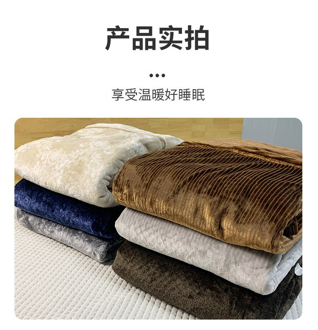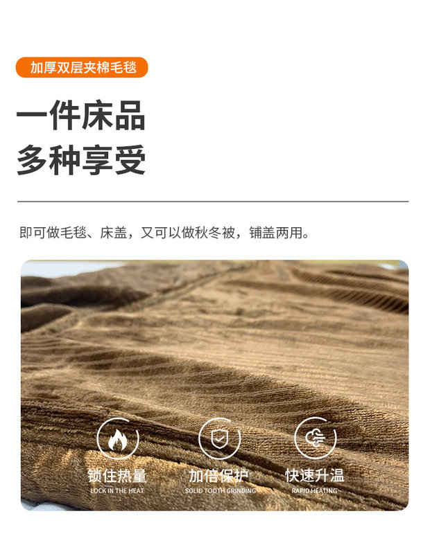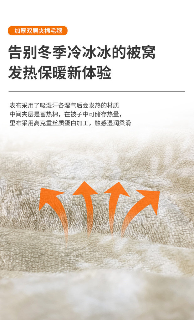 品名:尼達利吸濕發熱保暖加厚雙層夾棉毛毯 午休毯 材質:表布面料:聚酯纖維 填充物:聚酯纖維57% 粘纖纖維30%合成纖維13% 背部面料:錦綸53% 粘纖纖維38%合成纖維8%聚酯纖維1% 顏色:深藍 淺灰 米色 咖色 棕色 乳白色 褐色 尺寸:1.4×2米 1.7*2 米 1.8×2米 2*2.1米 重量:2-2.5公斤 優點:表布采用了吸濕汗各濕氣后會發熱的材質,中間夾層是蓄熱棉,在被子中可儲存熱量,里布采用高克重絲質蛋白加工,所以觸感濕潤柔滑,還具有吸濕防臭功能,有效控制溫度,減輕悶熱,特殊的紗線,減輕靜電帶來的不適。