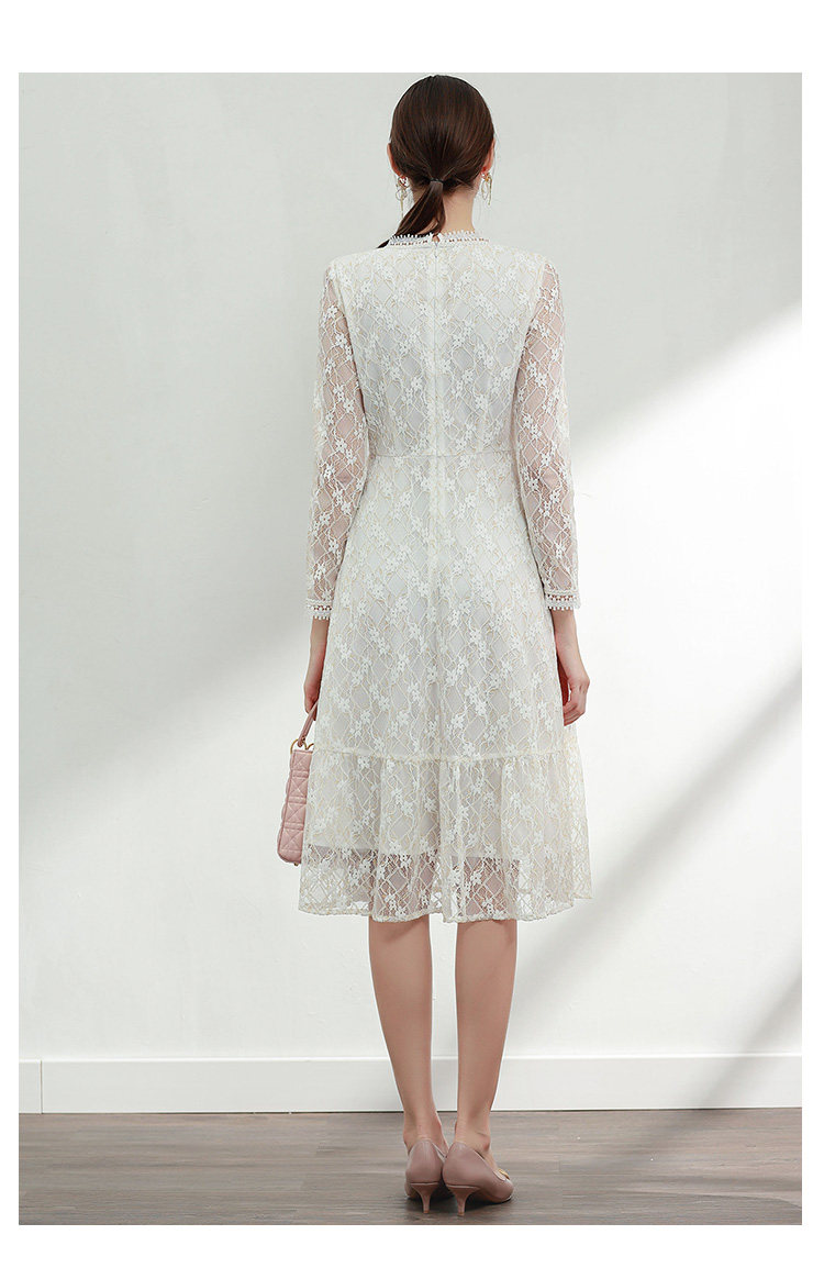 產品說明: 重工蕾絲面料、花邊圓領、裝飾紐扣、高腰A字版型、后中拉鏈、有里料