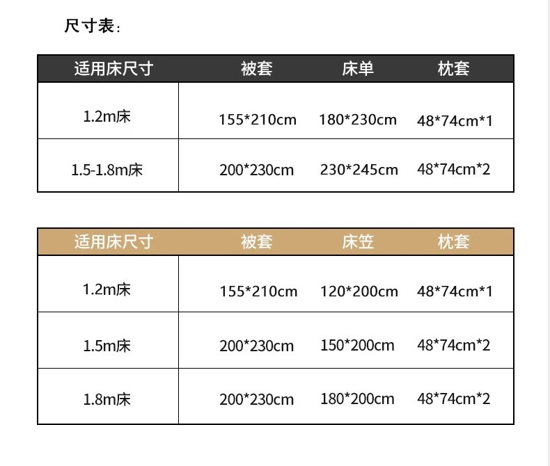 2.0m床:被套220*240cm 床單240*260cm 枕套48*74cm*2