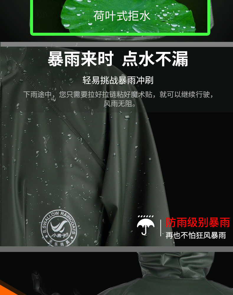 正品小燕子雨衣,外貿雨衣廠家,做工精細,雨衣質量非常好,很多快遞單位用我們家雨衣,順豐定制套裝雨衣,這款雨衣是高彈雨衣,環衛工人騎電動車摩托車戶外從事工作的都可以使用,不漏水,放心批發,歡迎致電詢問:13950193479 陳先生