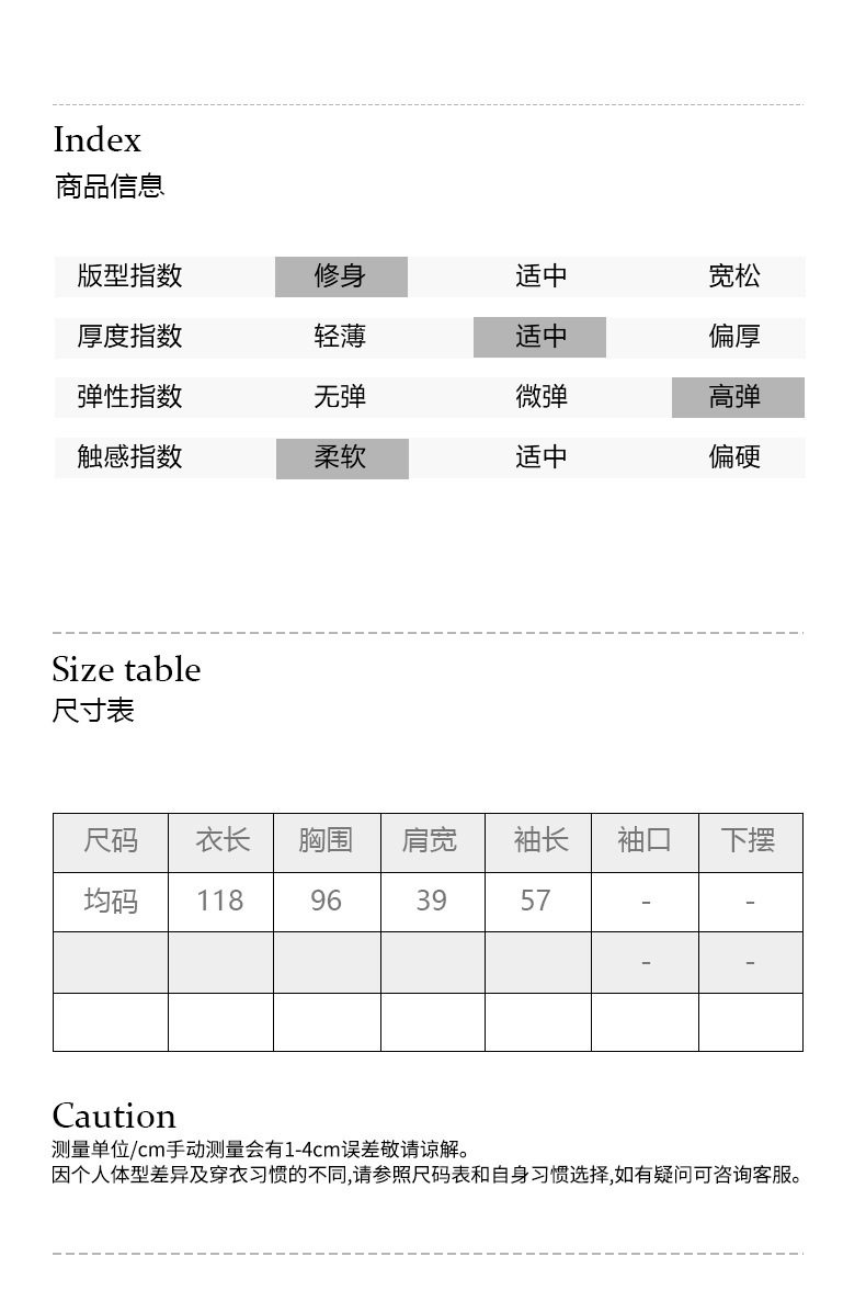 衣長118cm、胸圍96cm、袖長57cm、肩寬39