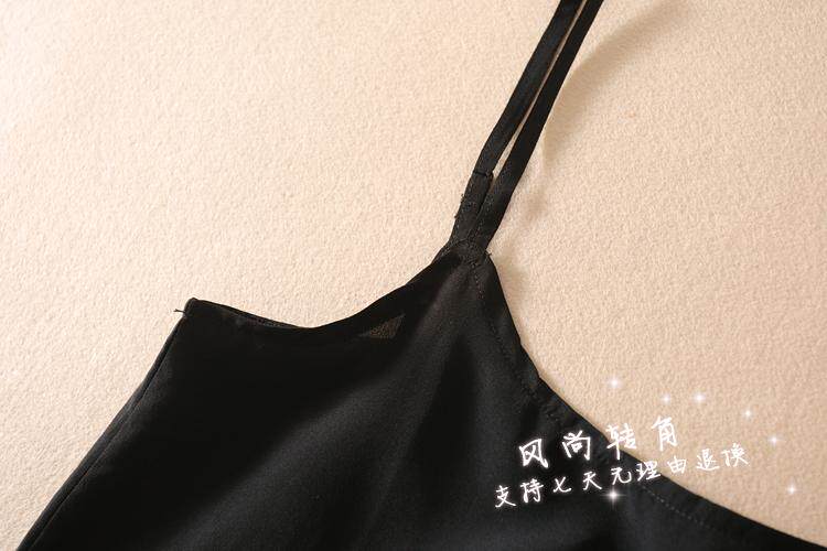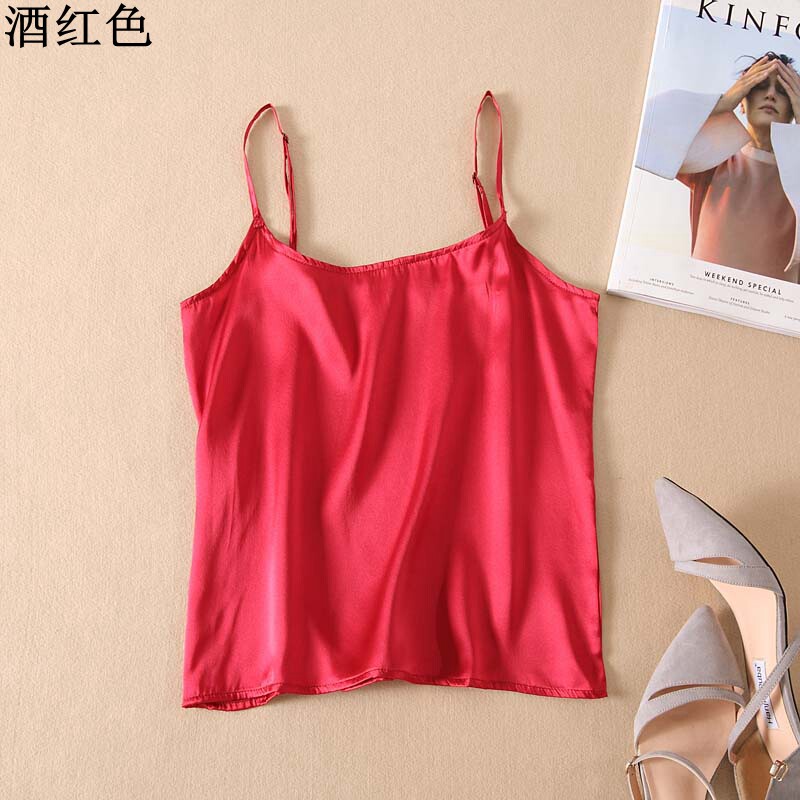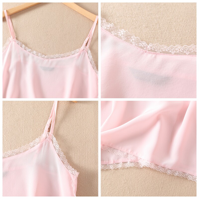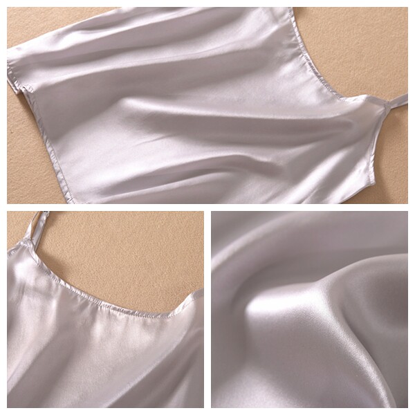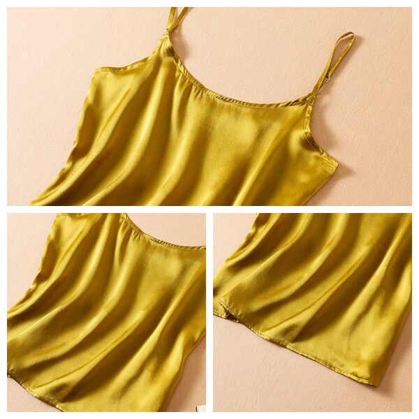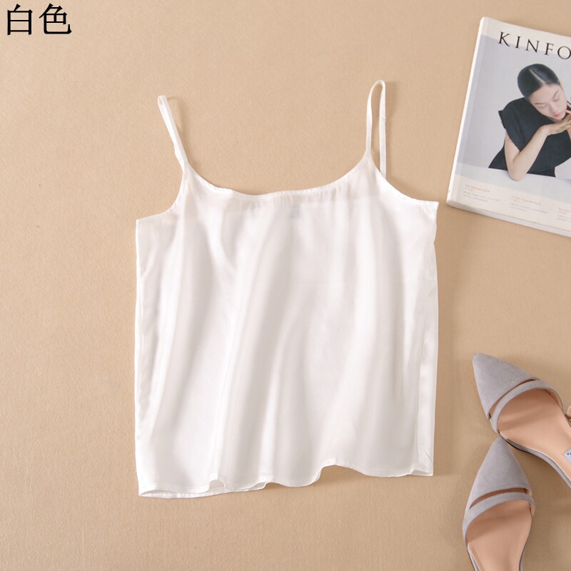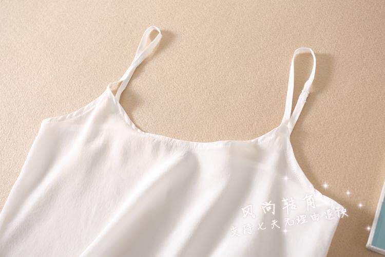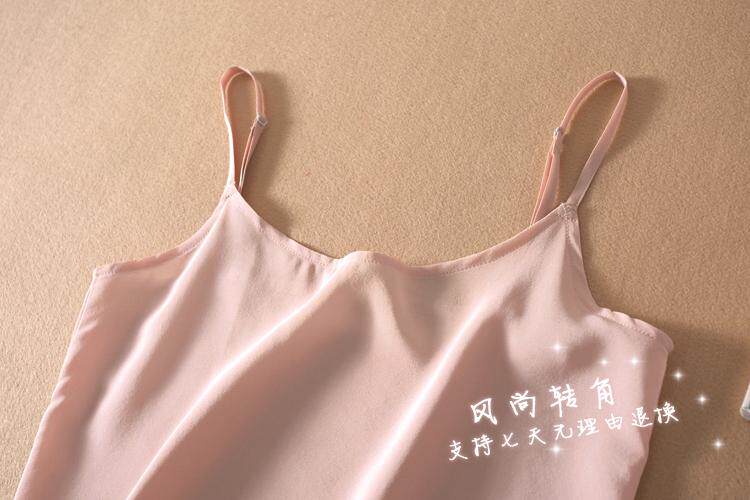 面料真絲雙縐,表面有肌膚般均勻紋理,泛淡淡光澤,圓領,光邊,簡潔的一款打底小吊帶,百搭,肩帶可調節,穿真絲對皮膚好