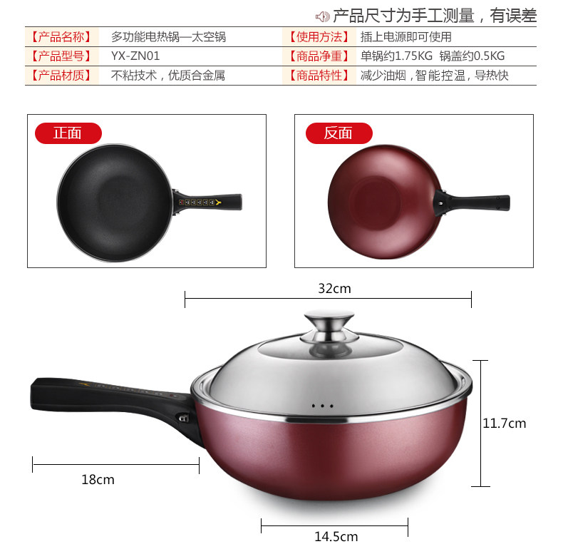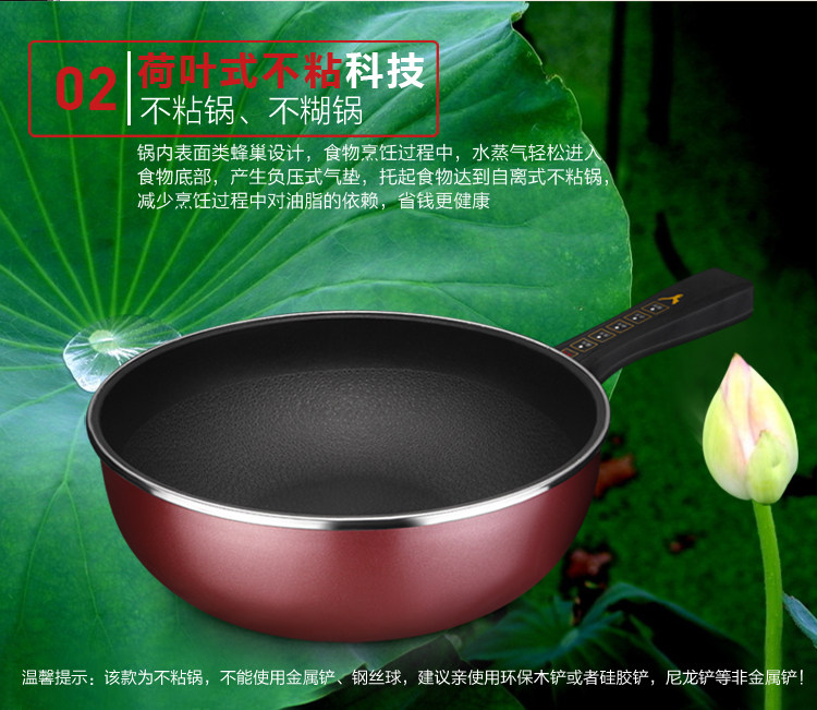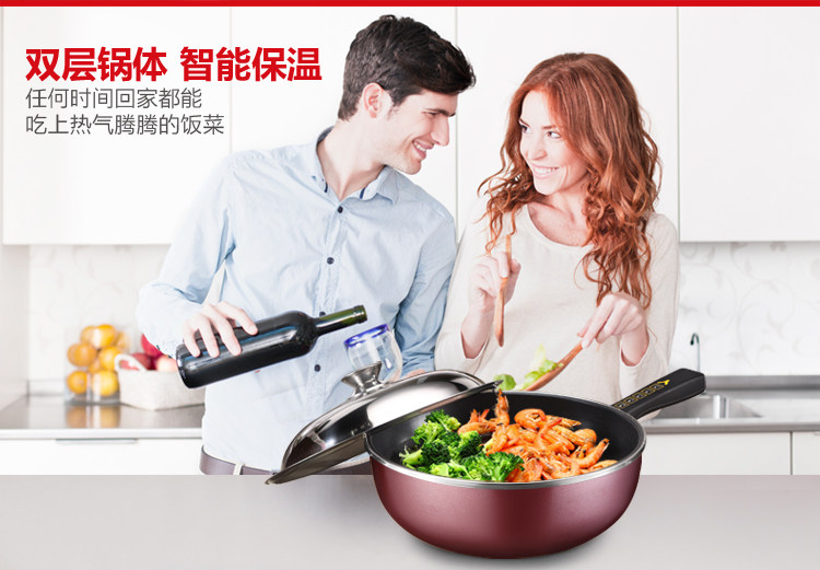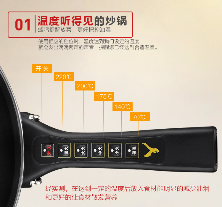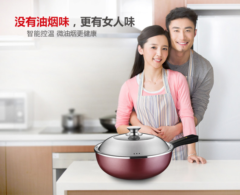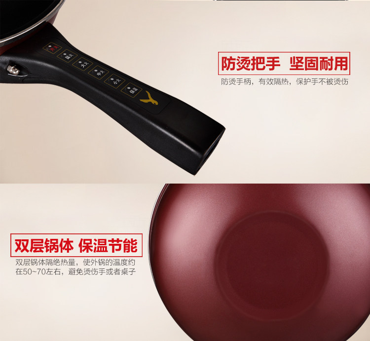 本款電炒鍋有智能控溫功能,當某個檔位溫度超過系統設定溫度時,電炒鍋會自動斷電,不會因為溫度過高產生有害物質,同時保護電炒鍋,當溫度下降到額定溫度時,電炒鍋會自動重新開始加熱。