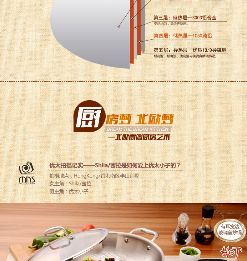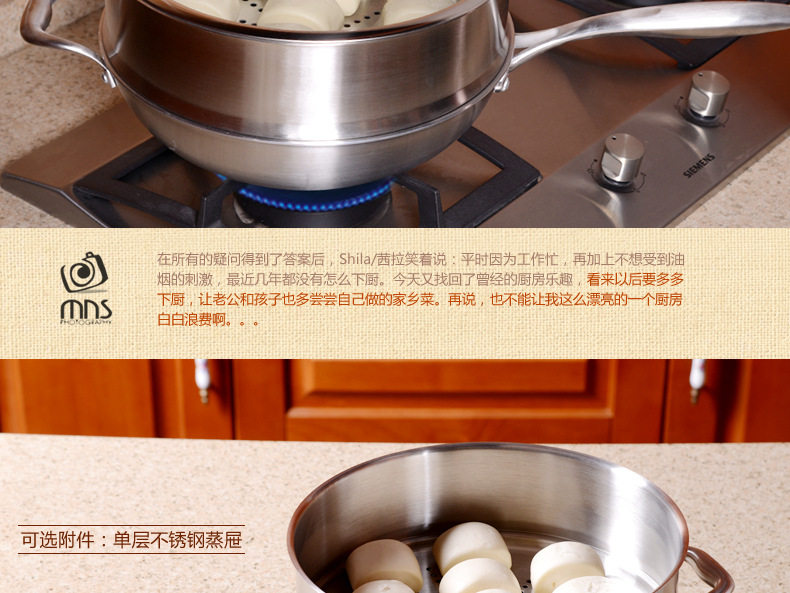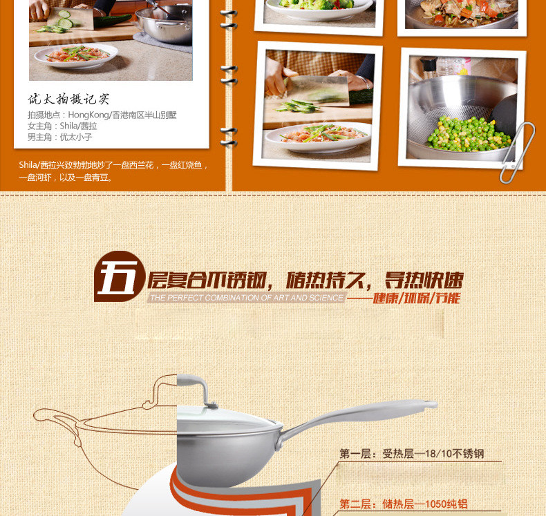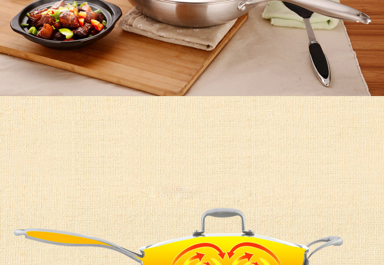 實現物理性不粘的方法:煎炒容易粘鍋的食材比如肉絲,雞蛋,魚。首先開火(中火)-熱鍋(1到3分鐘)-下油轉小火-10秒左右油熱后下菜。等到鍋具受熱以后,炒第二道菜就不需要再預熱了。五層鍋有設置兩層儲熱材質。