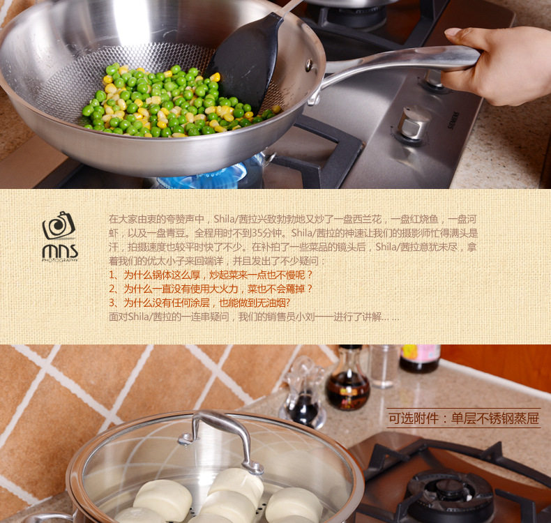 物理性不粘和化學不粘(涂層不粘)是兩回事,物理性不粘需要由鍋體的溫度來掌控,它的不粘原理:醫用不銹鋼通過加熱使金屬表面原子產生致密層,從而達到不粘的效果,所有的不銹鋼鍋具的物理不粘性都要靠對鍋具溫度的掌控,包括國際大牌雙立人、菲仕樂等均一樣:煎炒容易粘鍋的菜,要先把鍋具空燒三分鐘再下油,不銹鋼的物理性不粘就可以得到充分發揮。