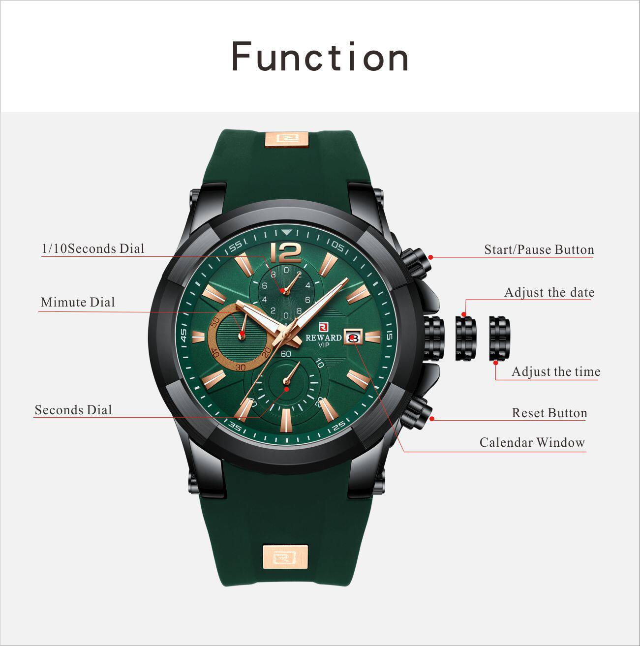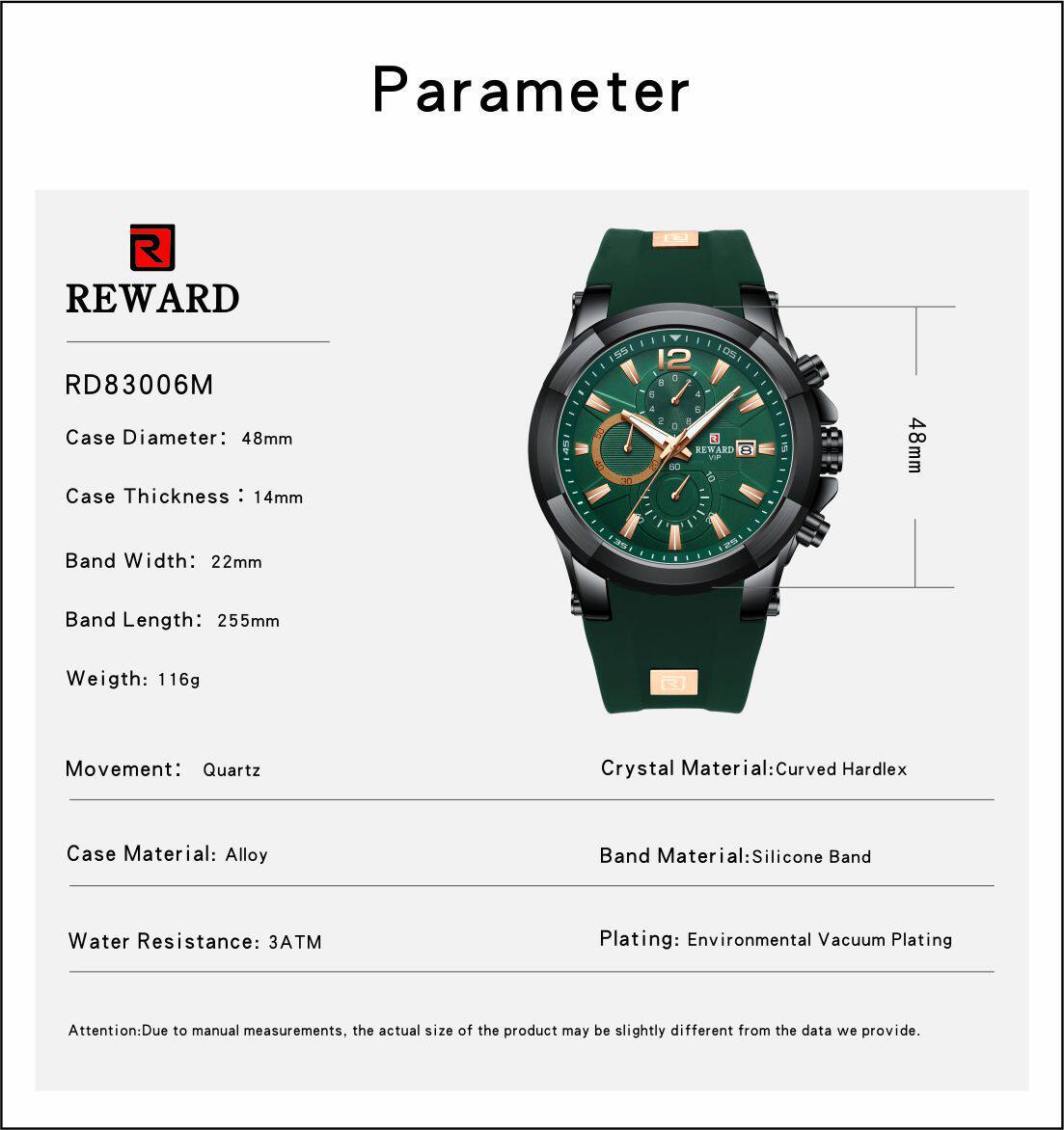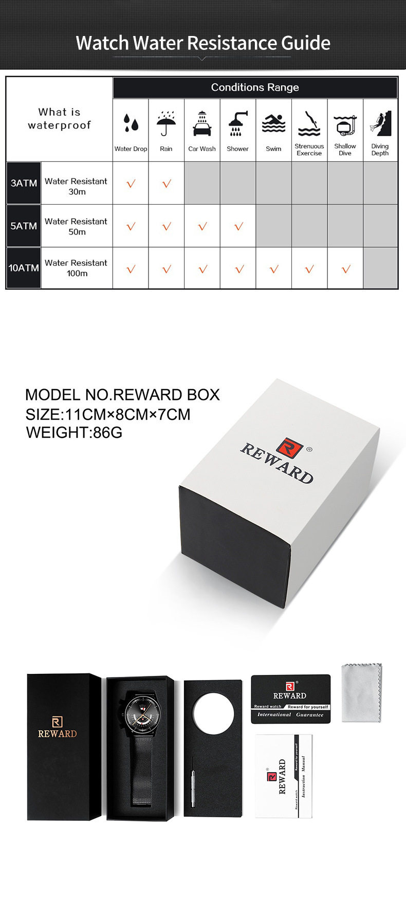 3、防水裝置之手表100M以上,后蓋鎖牙方式,可浸水但不得游泳潛水。