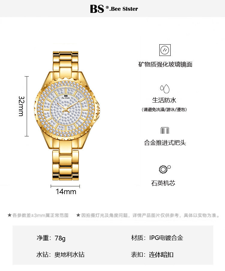 材質:IPG 高品質真空電鍍表殼 進口捷克鉆石鑲嵌