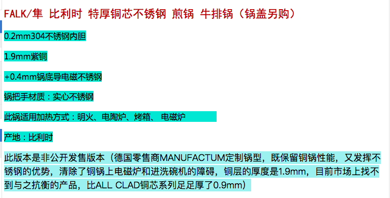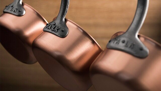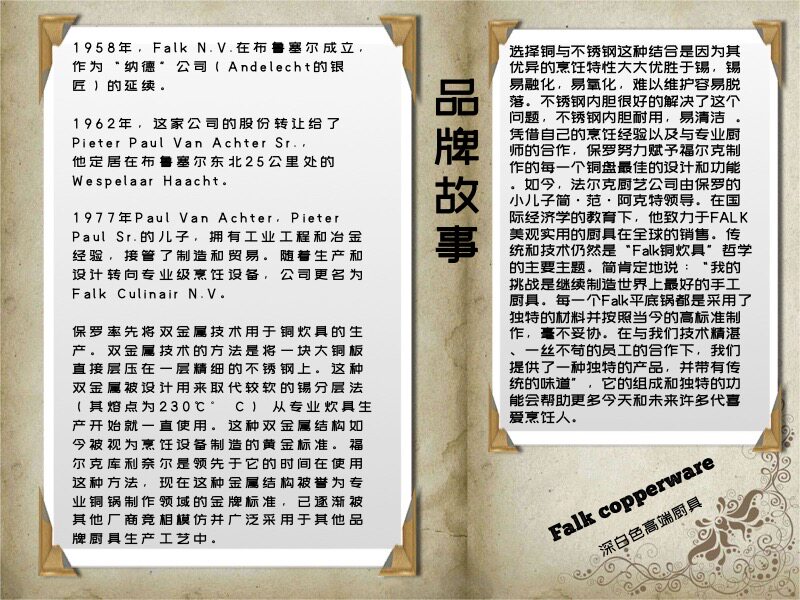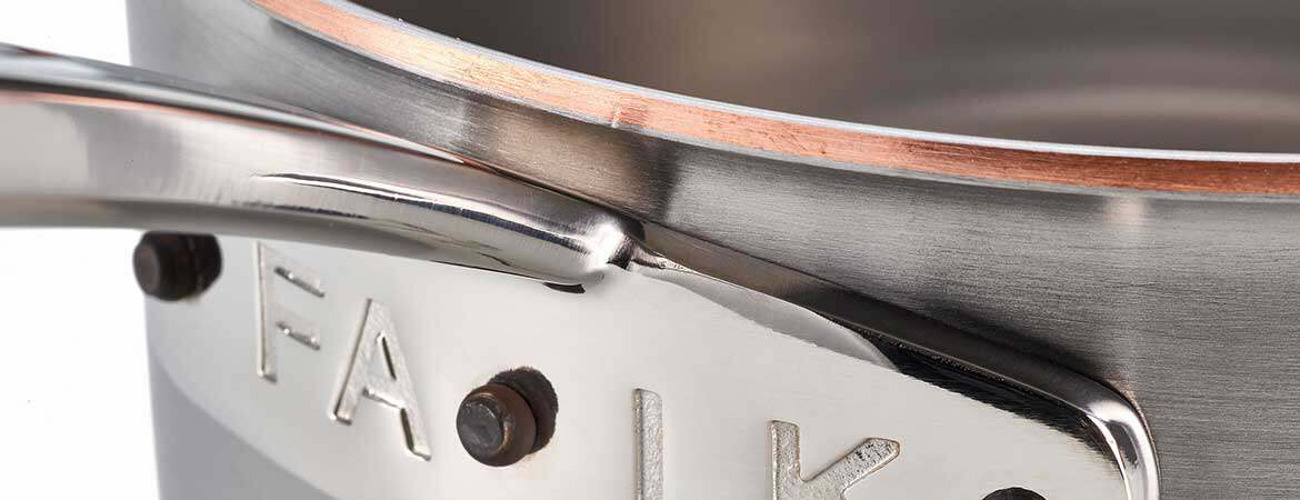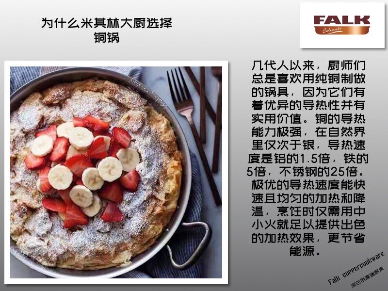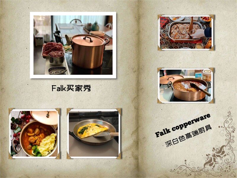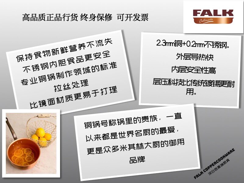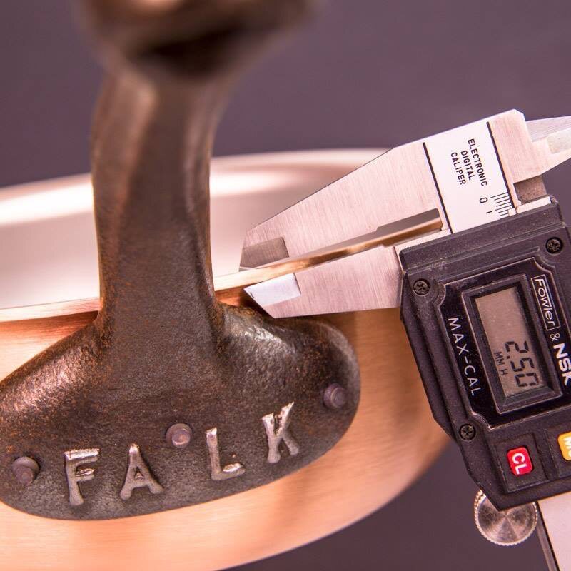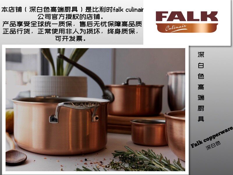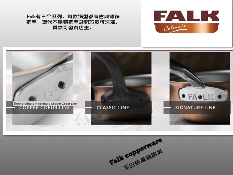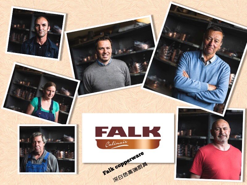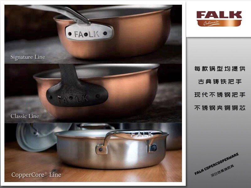 比利時的 Falk Culinair,1958年由 Pieter Paul Van Achter所創立,他們的厲害之處是非常專業的處理技術,鍋體由 0.2毫的內涂層和 2.3毫米紅銅制作而成,比例保證了均勻導熱,也更能讓食物留有原始風味。