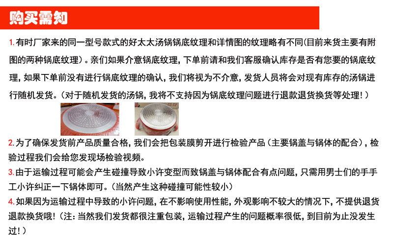 本店對包裝進一步升級,實行發貨前檢查,同時包裝實行4層防護,規格稍大點的更是實行5層防護包裝,此包裝已經過多長時間的驗證,非常有保障,請各位親們放心購買!!!同時贈送運費險-購買湯鍋時,同時自助購買運費險,收到貨后,兩天內找我們客服領取1元的運費險紅包哦。