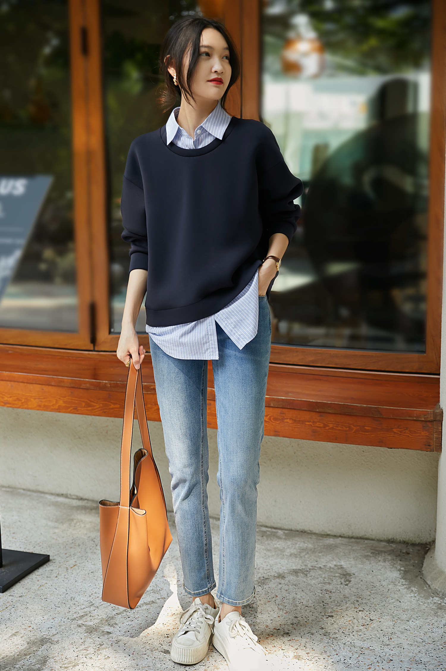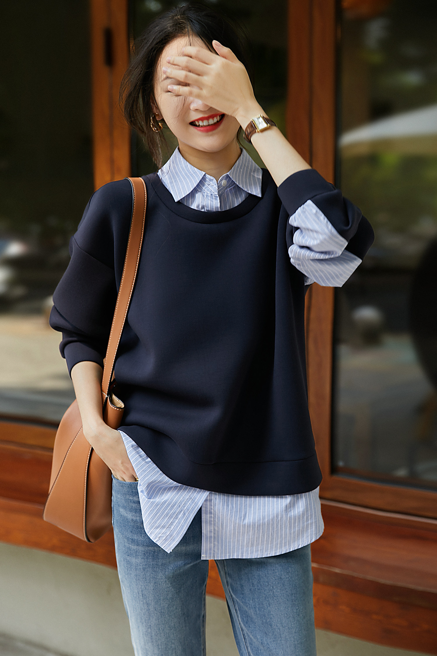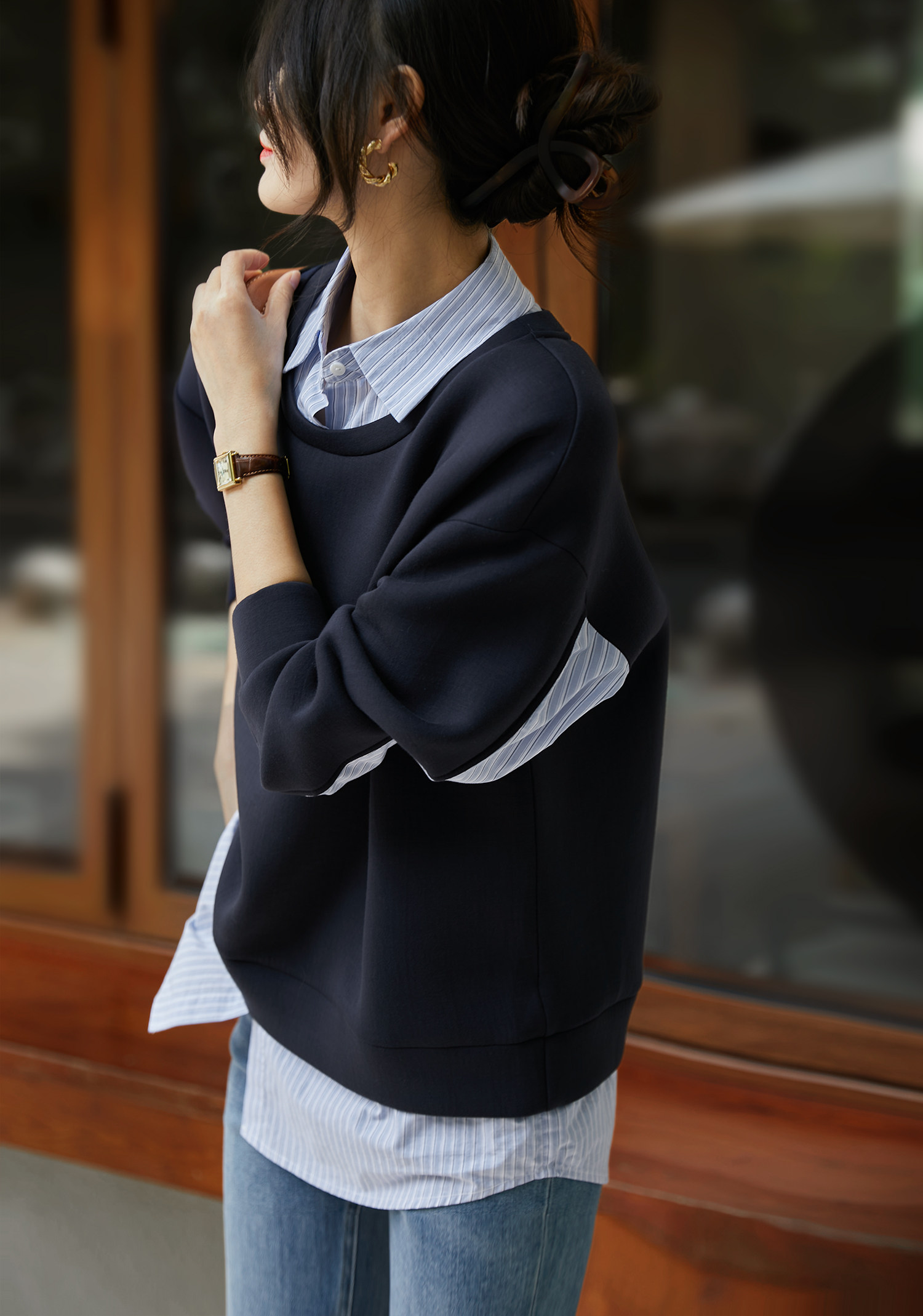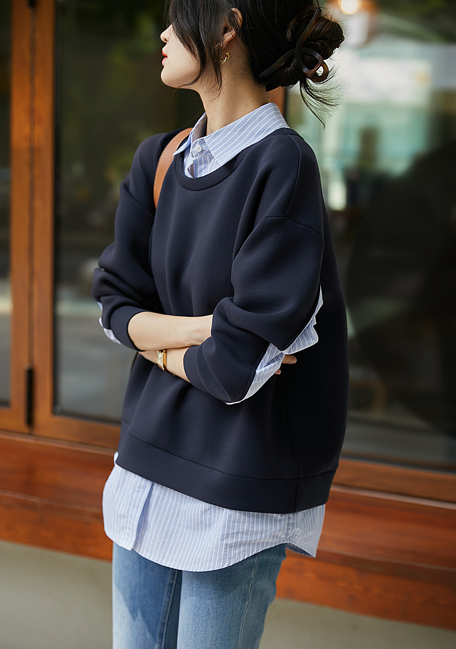 復古條紋襯衫與衛衣的疊搭