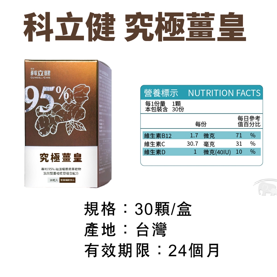 成分:CURCUMIN C3 COMPLEX薑黃黄萃取物、Ginactiv生薑萃取物、Nutrieast酵母粉(啤酒酵母發酵物、乳清蛋白粉、初乳粉、麥