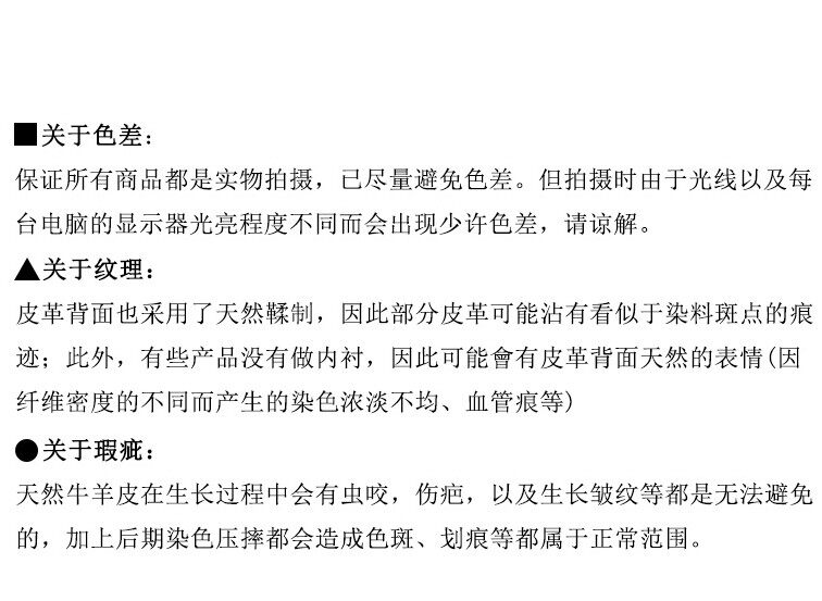 天然牛皮制品會有各種色斑和劃痕以及皮損傷疤痕跡,每塊紋理各不相同,介意慎拍!