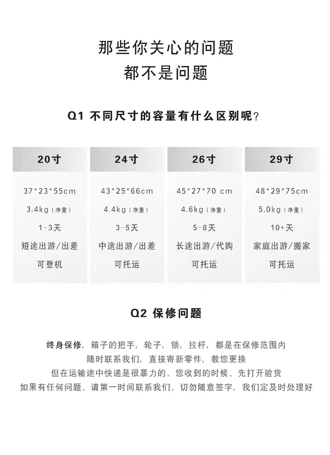 追加服務:次使用如出現箱子箱體裂開等箱子質量問題(非托運,非快遞造成的)。我們承諾給予免費更換全新的箱子并承擔來回運費。(可用于購買箱子一個月內使用)