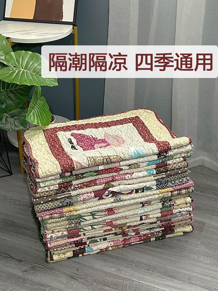 正面純棉布,背面防滑顆粒底布,棉加纖維填充,三層細密絎縫