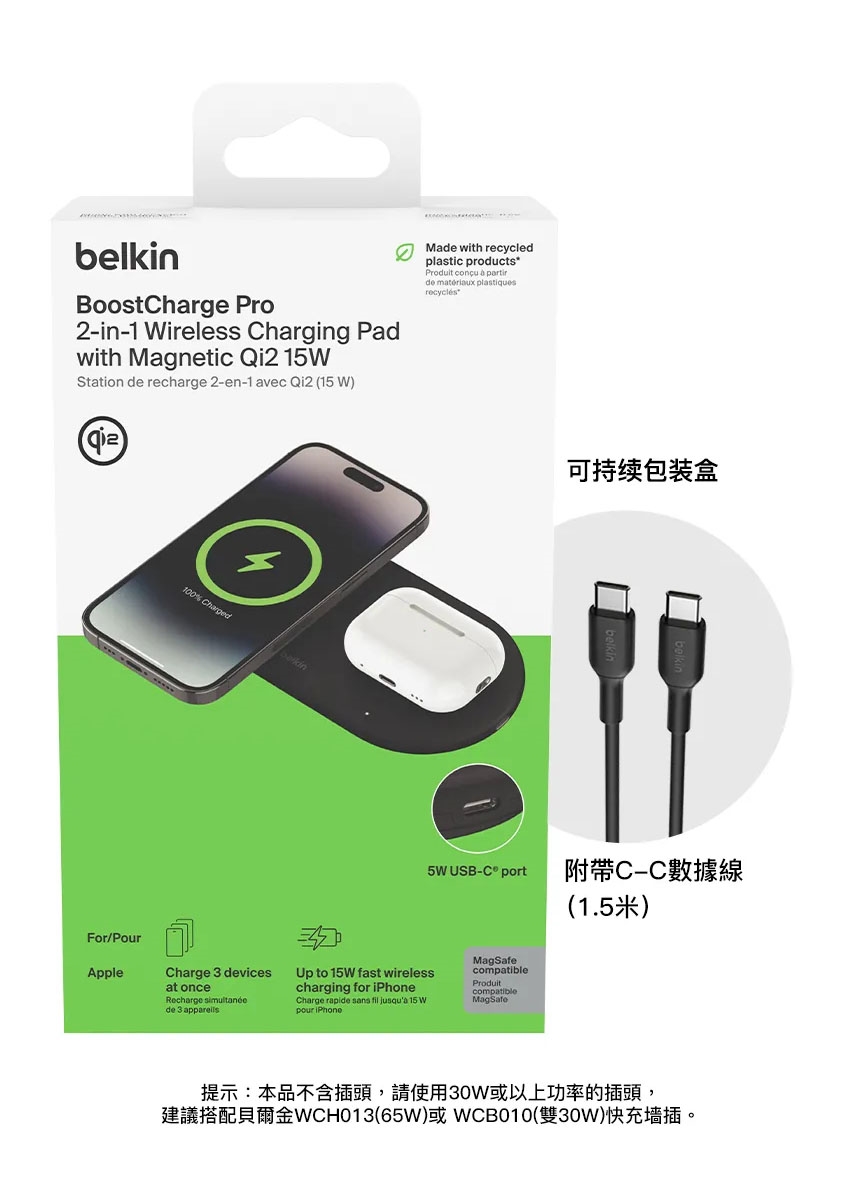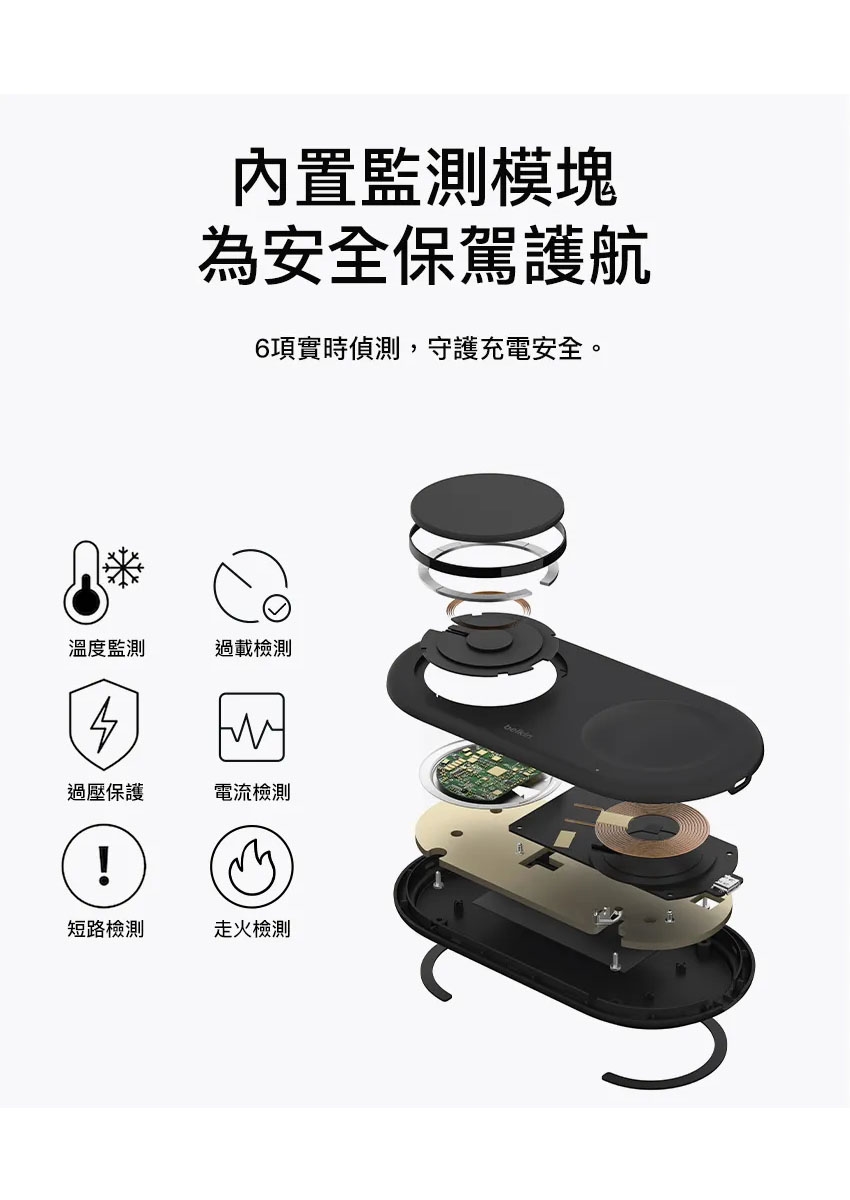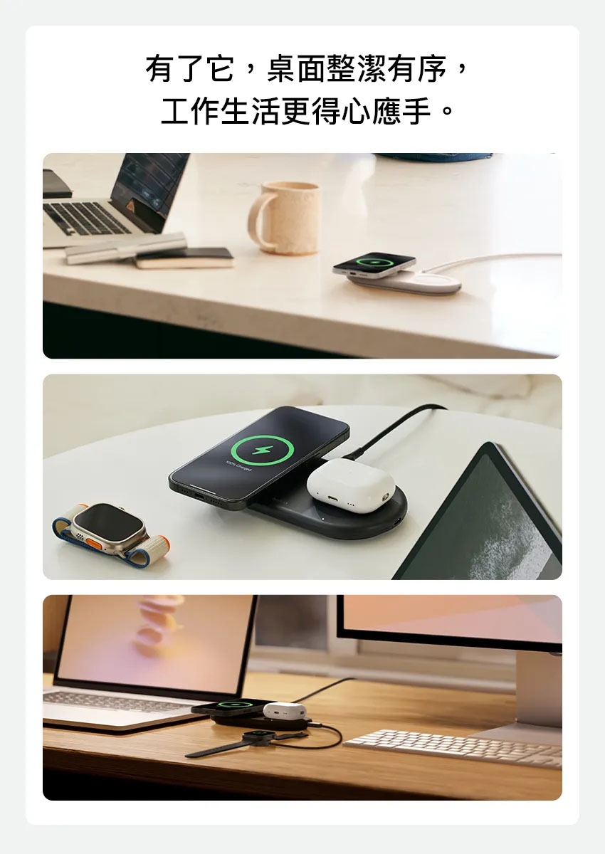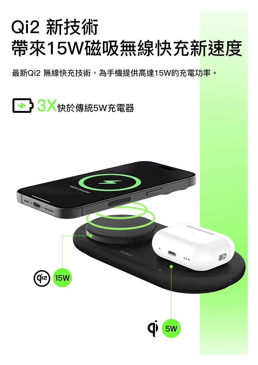 BELKIN貝爾金 BoostCharge Pro Qi2 15W 2合1 磁吸無線充電板