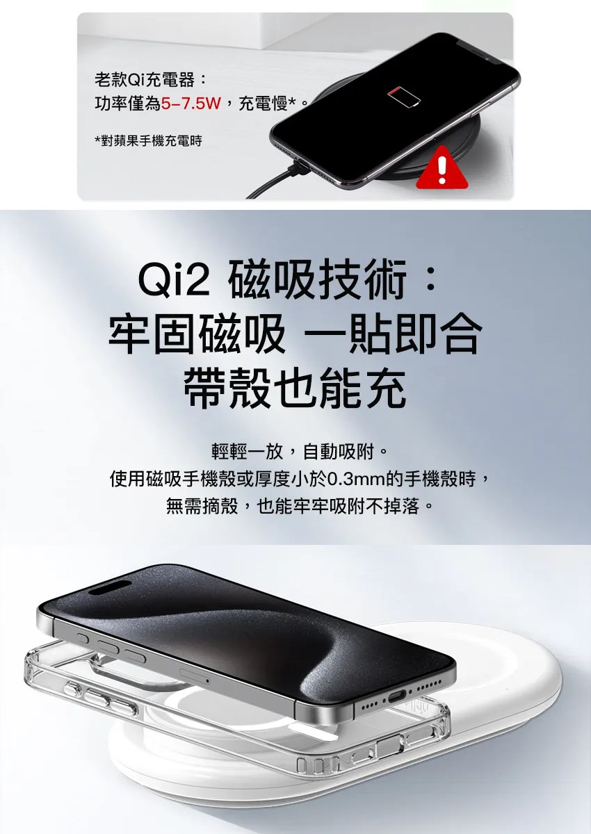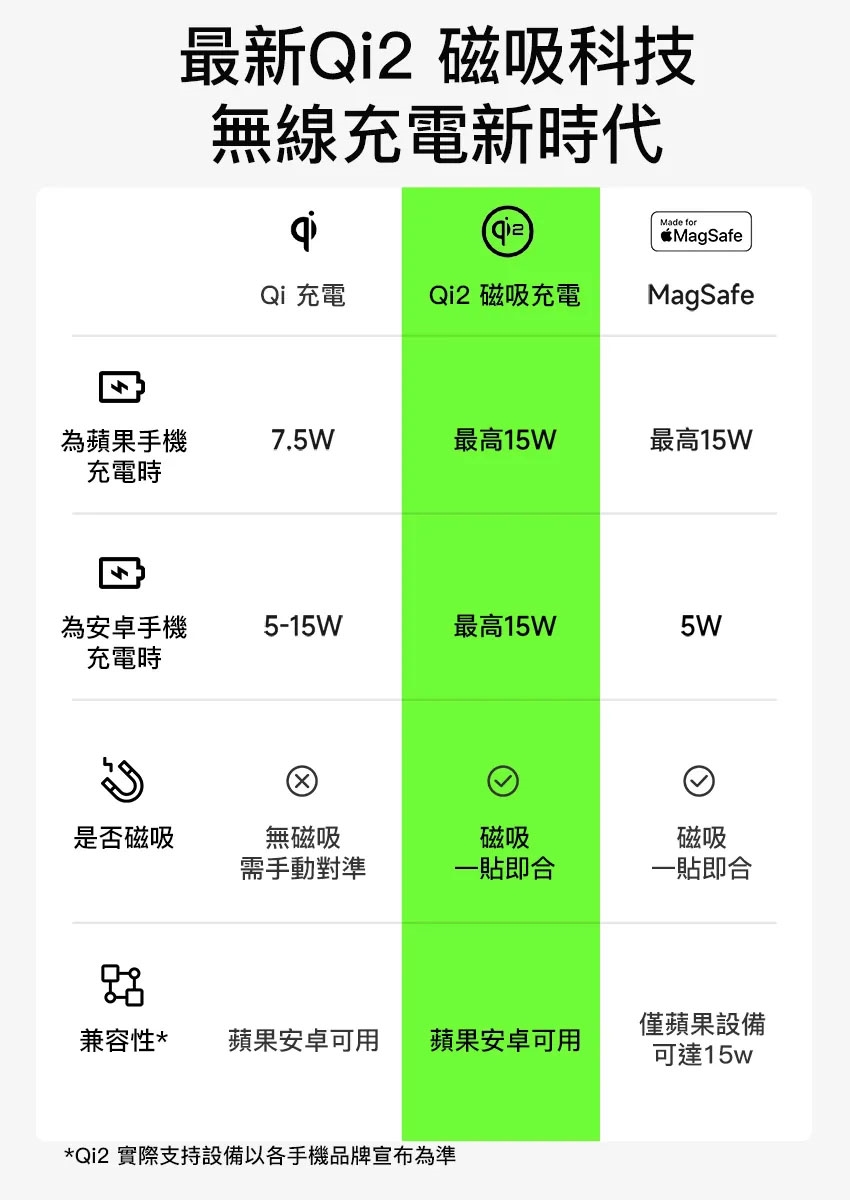 - 利用磁吸 Qi2 為 iPhone 無線充電,功率高達 15W