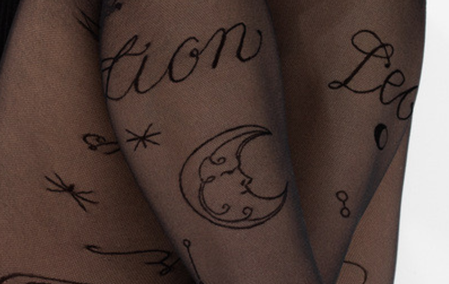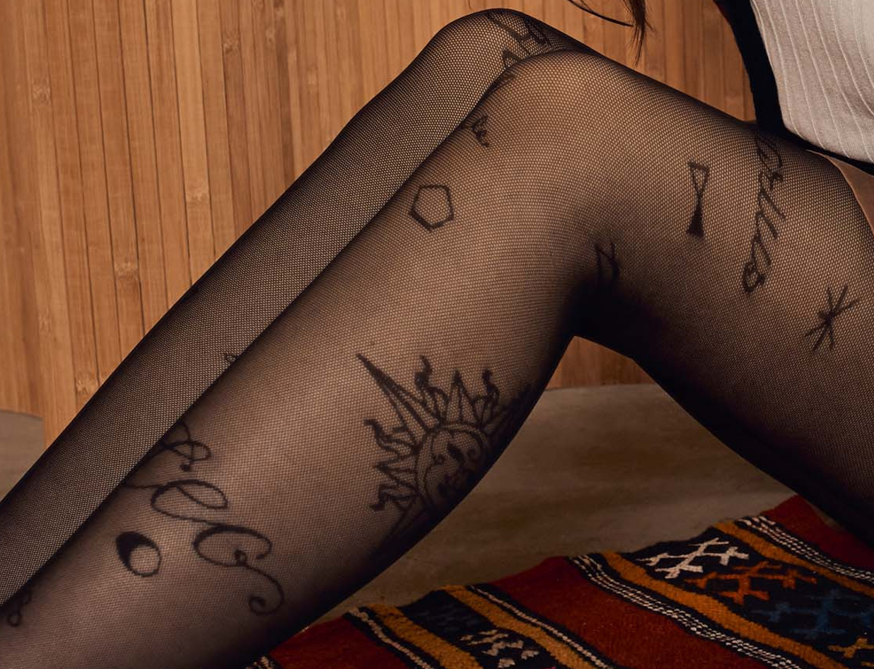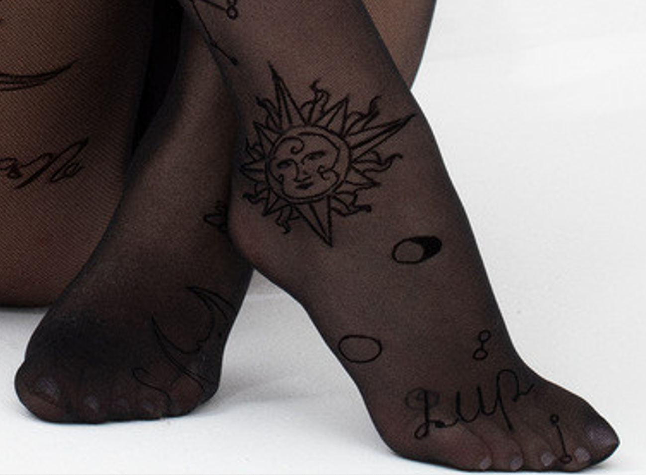 The phrase ‘legs for days’ takes on a new meaning with these tights. We can spot many symbols, constellations and phenomena straight from the starry sky on them, with eye-catching inscriptions in between. The legs look chic and mysterious, and the effect is further enhanced by the deep black colour of the tights.