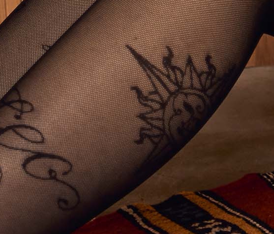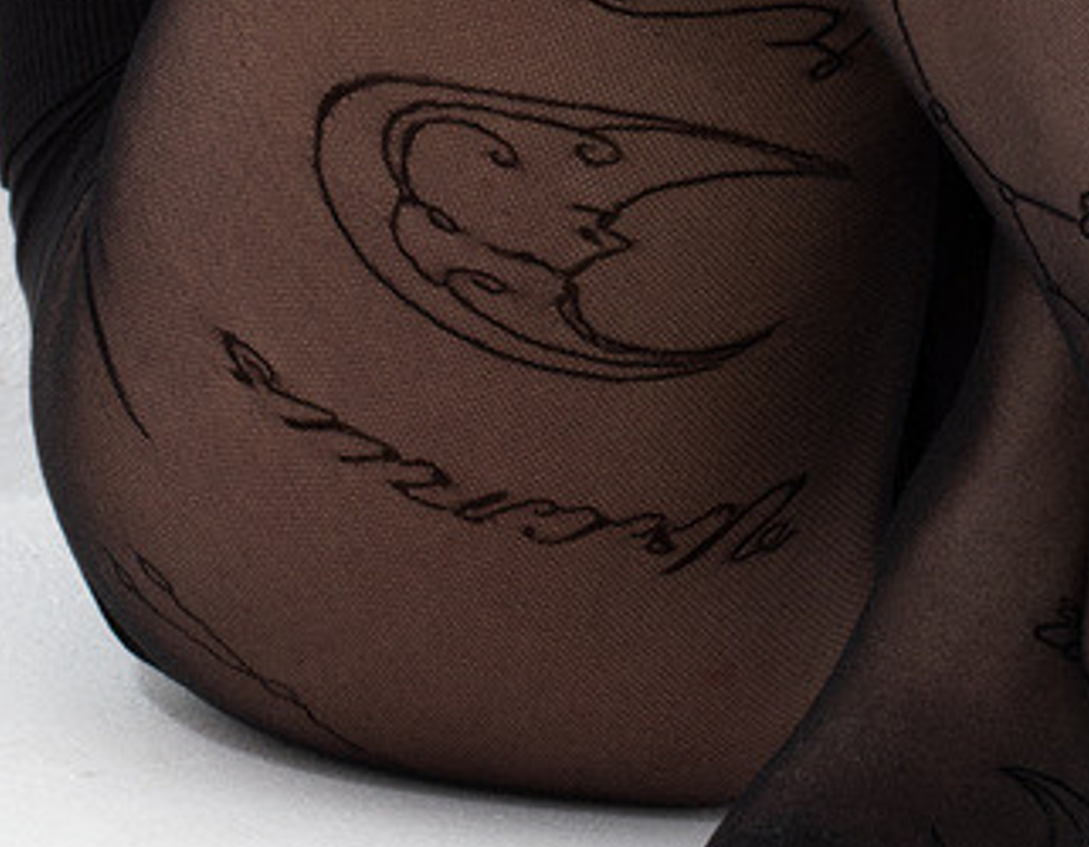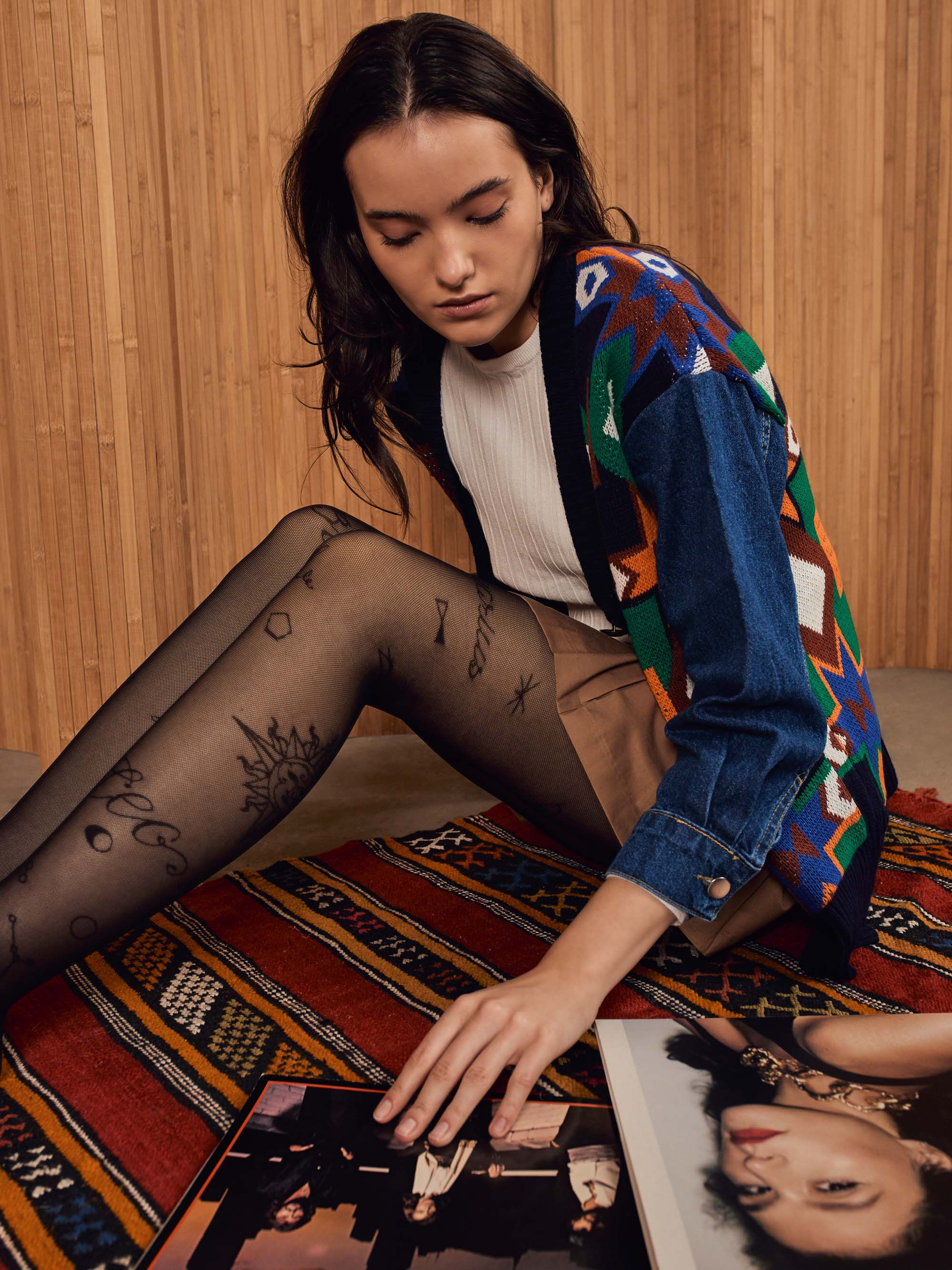 The phrase ‘legs for days’ takes on a new meaning with these tights. We can spot many symbols, constellations and phenomena straight from the starry sky on them, with eye-catching inscriptions in between. The legs look chic and mysterious, and the effect is further enhanced by the deep black colour of the tights.